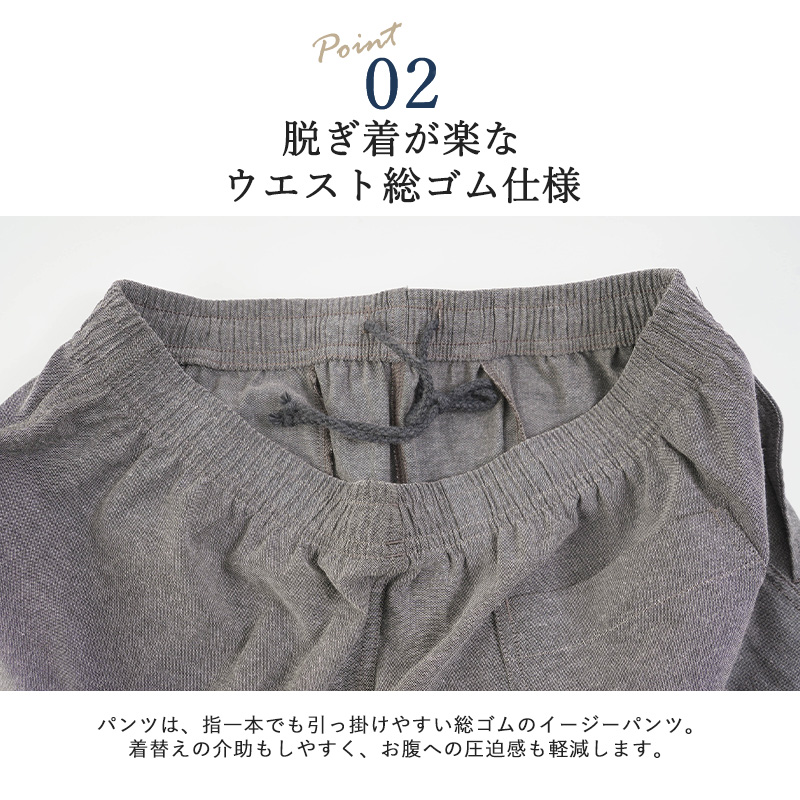 パンツのウエストは全面ゴム仕様で、お腹周りを締め付けず一日中快適です。内側の紐でサイズ調節も可能。適度なゆとりがあるシルエットなので、動作を妨げず、車椅子の方や足腰が不安な方でも楽に着用いただけます。