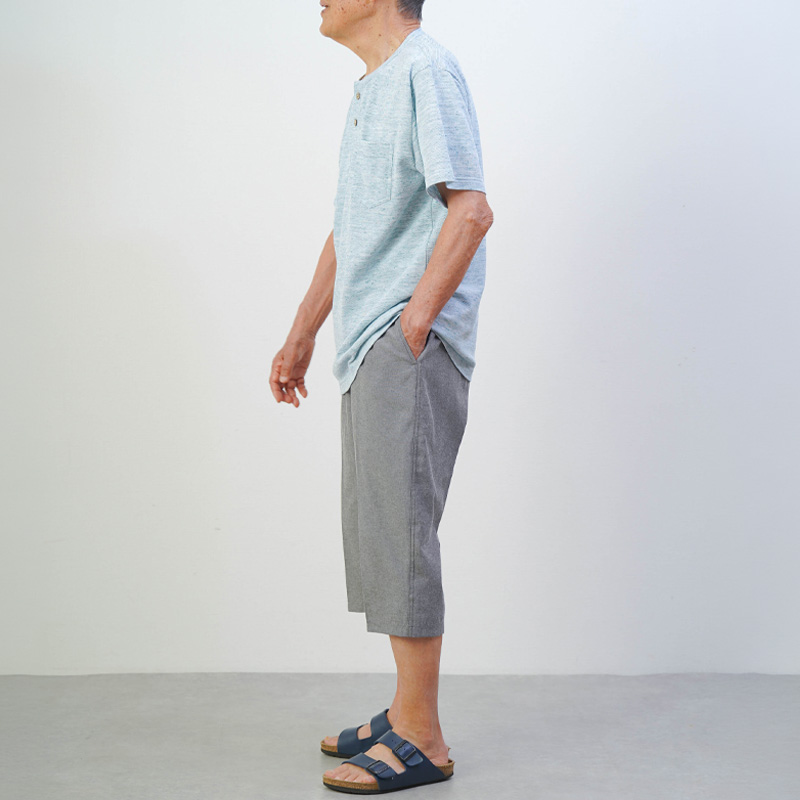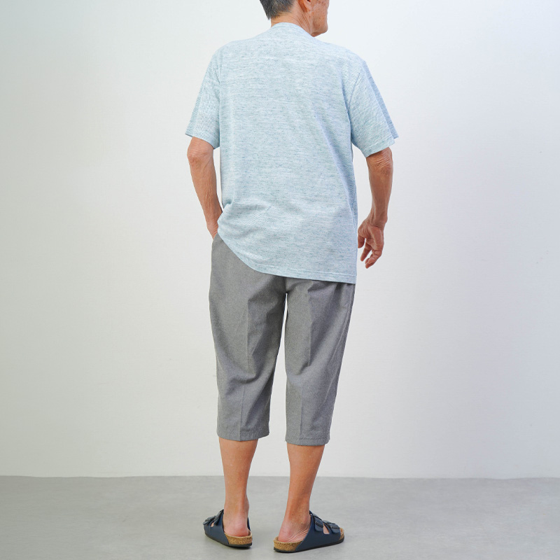 綿混素材の鹿の子生地は、丈夫で型崩れしにくいのが特長。毎日のお洗濯でもヨレにくく、乾燥が早いのも嬉しいポイント。ご自宅はもちろん、衣類の管理を任せる施設入居時の持ち込み服としても、非常に重宝されます。
