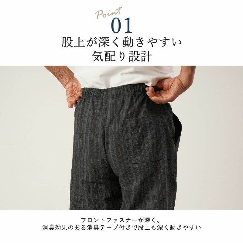 ● ウエスト総ゴムと調整紐でフィット感を調節可能。股上がゆったりしており、前ファスナー付きで着脱も楽々