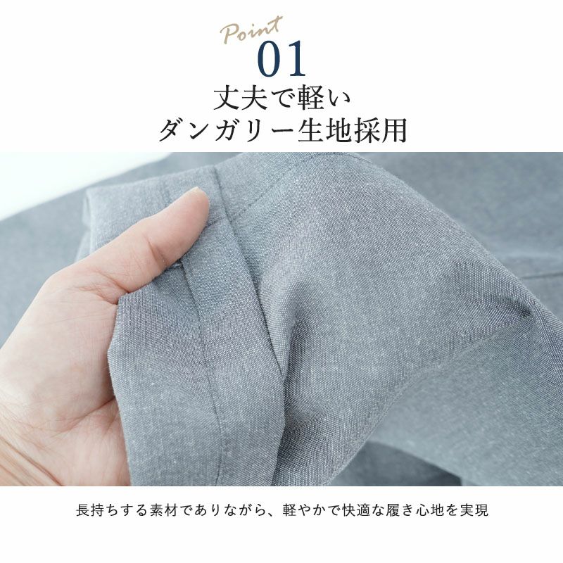 ●軽くて丈夫!快適なダンガリーストレートパンツ:タテ糸に白糸・ヨコ糸に色糸を使用した綾織り生地「ダンガリー」を採用。丈夫で長持ちしながら、軽やかで快適な履き心地を実現。