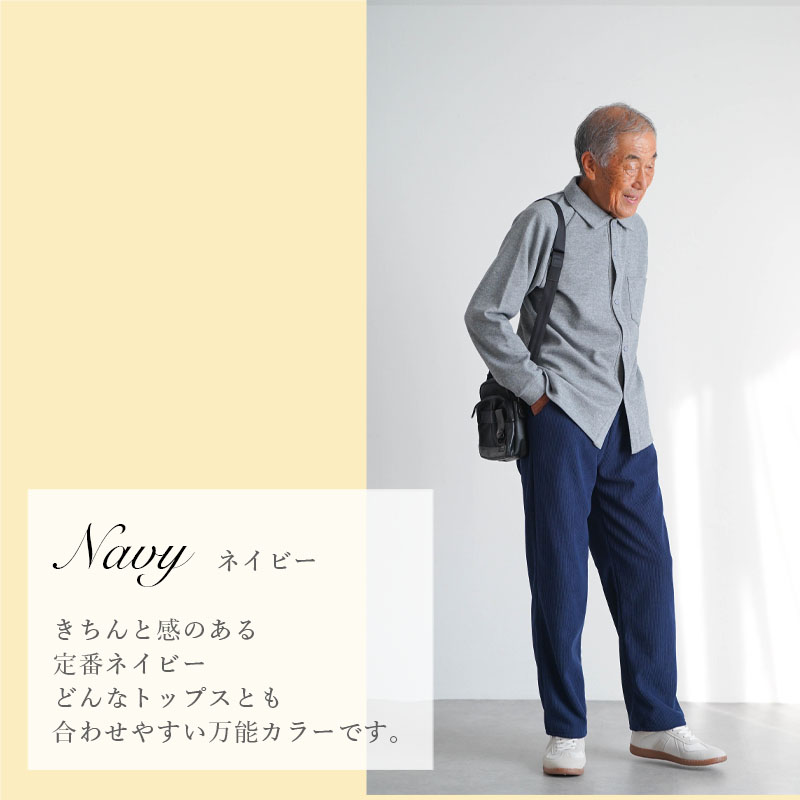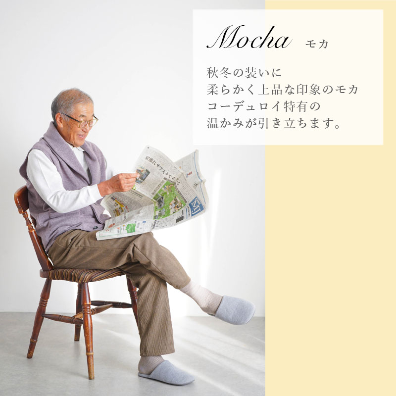 ●コーデュロイは通常伸びない素材が多いですが、このズボンは横方向にストレッチ性があるので、しゃがんだり座ったりの動作も楽にできます。