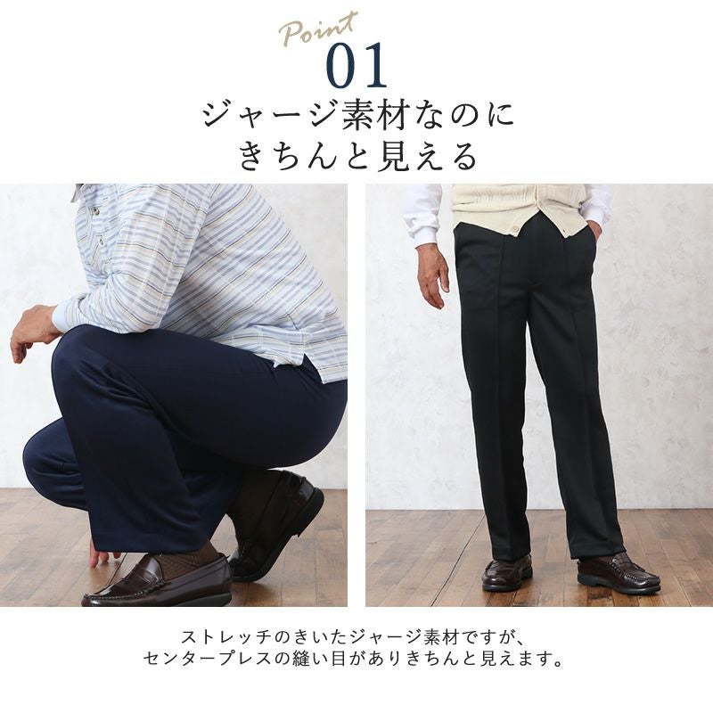 ジャージ素材で伸縮性抜群なのに、きちんと見えるスラックスパンツ。