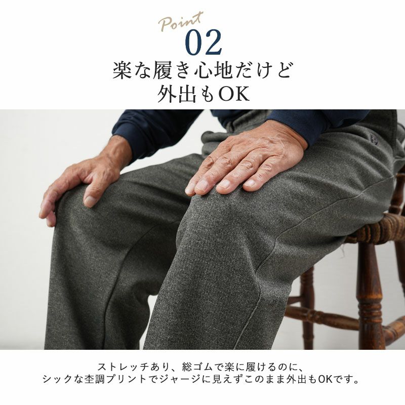 しっかり厚手の裏起毛で真冬に対応するぽかぽか総ゴムパンツ。表地は細かな杢調プリントのストレッチ素材を使用し、ストレスフリーの着心地です。ウエストは総ゴムで、楽に脱ぎ着ができます。