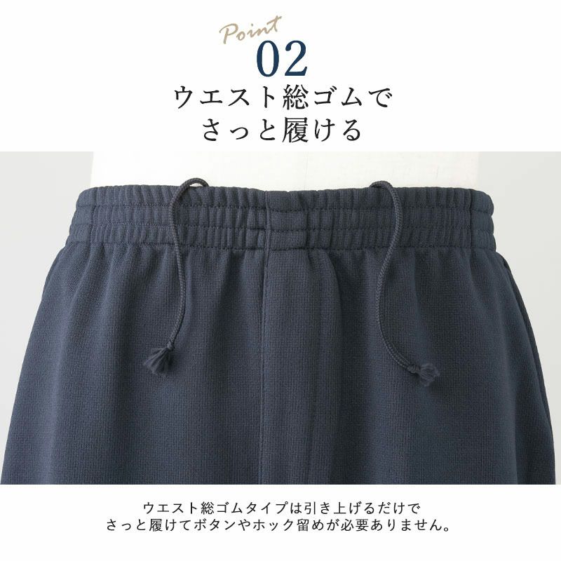 ウエストは総ゴム仕様だから伸縮自在で、はき心地はゆったり。