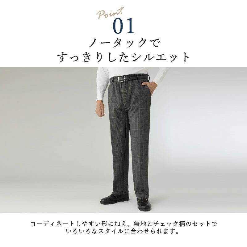 ●裾直し不要で股下60cm、65cm、70cmから選べ、届いてすぐにお使いいただけます。無地のネイビーとチェック柄のチャコールグレーの2色セット。