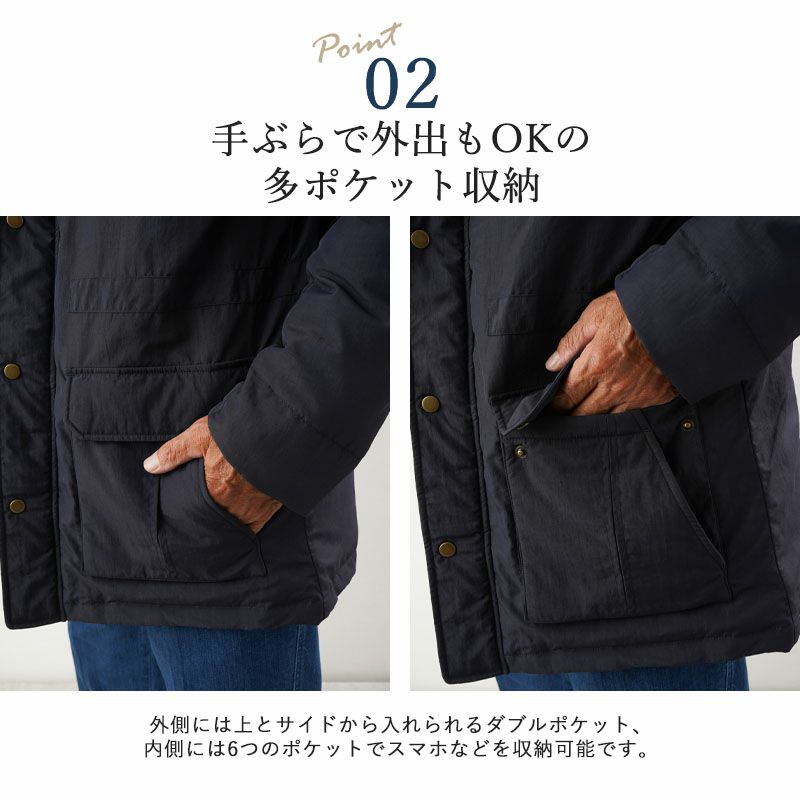外側には上とサイドから入れられるダブルポケット、内側には6つのポケットでスマホなどを収納可能。手ぶら派の方にもおすすめのアウターです。ウエスト部を絞れる調整紐つき、フードは取り外し可能です。