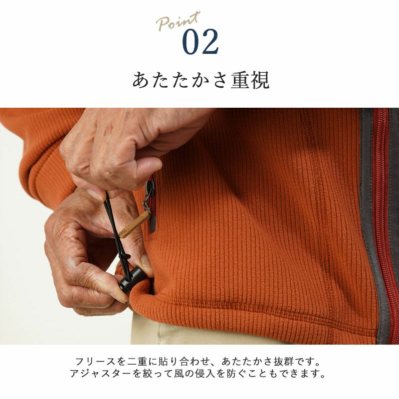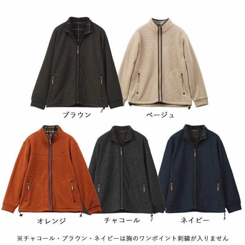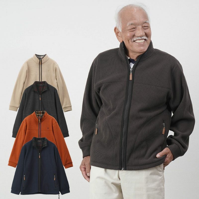 寒い季節におすすめのフリースを二重に貼り合わせた、フルジップジャケット。表は細コール(コーデュロイのような畝)、裏はチェック柄で見た目にも暖かくお洒落な印象です。裾は締め付けのないデザインですが、アジャスターがついているので、絞って風の侵入を防ぐこともできます。