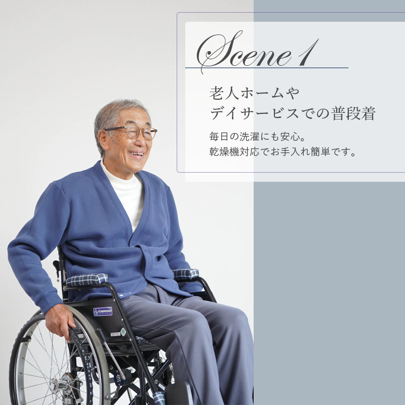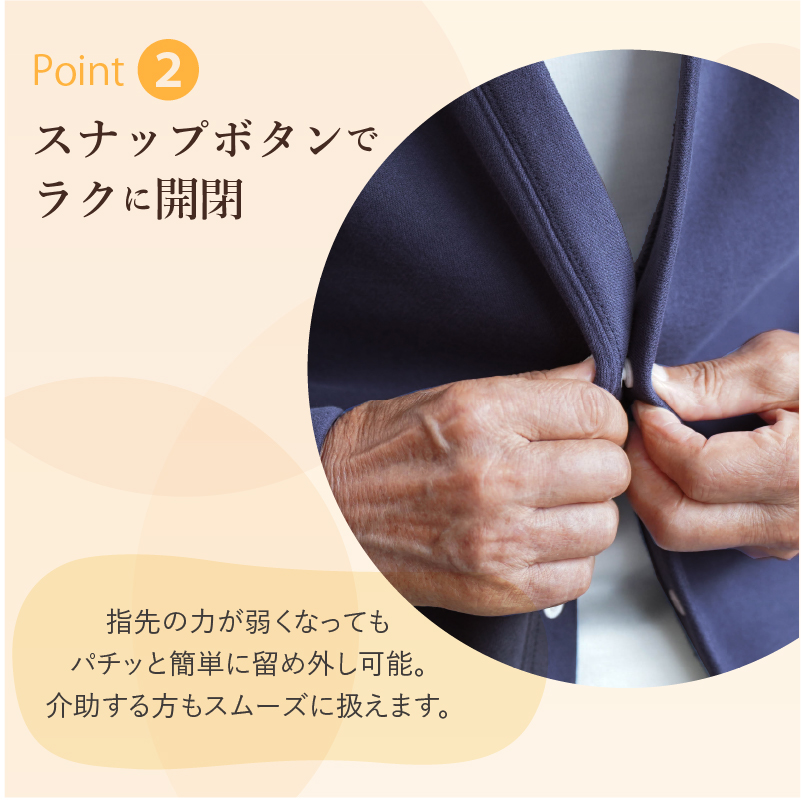 ●スナップボタン仕様で、指先の力が弱くなった方でも開け閉めしやすく、介助時の負担も軽減します。