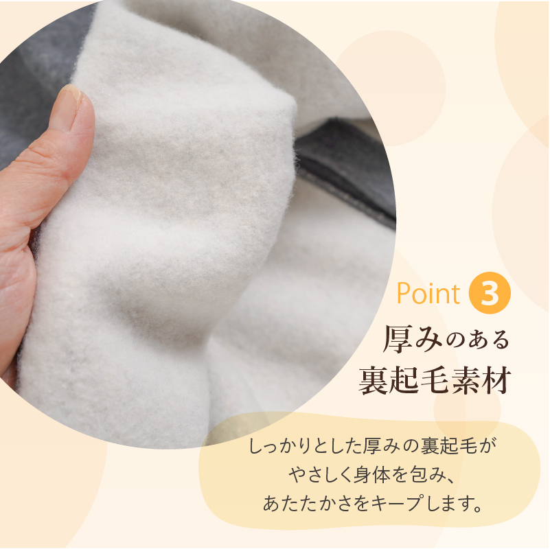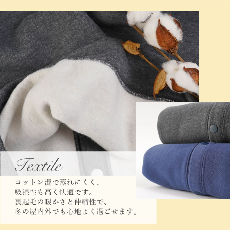●厚みのある裏起毛素材でしっかり暖かく、コットン混なので蒸れにくく快適に着られます。
