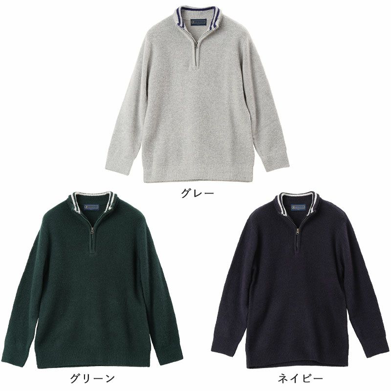 冬に人気の着やすいハーフジップセーター。7ゲージで薄すぎず厚すぎないちょうどいいニットは、シャツの上に重ねたり、ジャケットのインナーに着やすい1枚です。全体は無地ですがハイネックの内側には2本ラインの切替デザインがありスポーティな印象です。