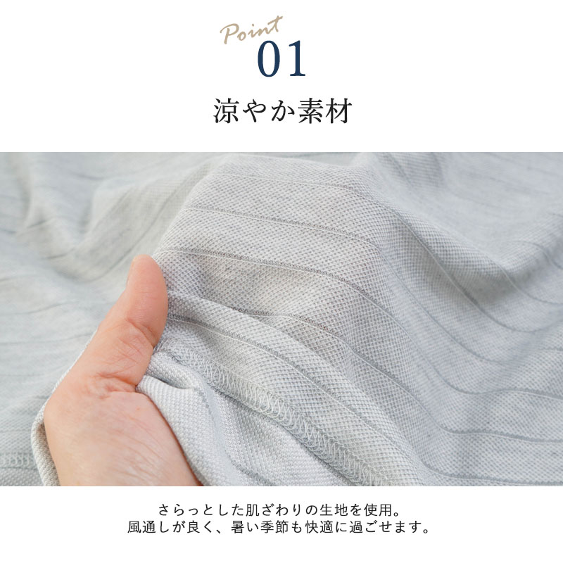● 上品なボーダー柄と、ライン入りの襟がポイント。室内着にも外出着にも使えるデザインです。