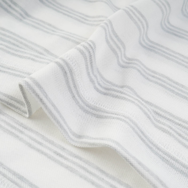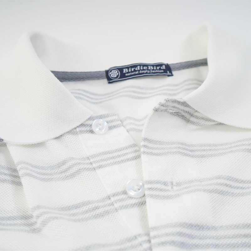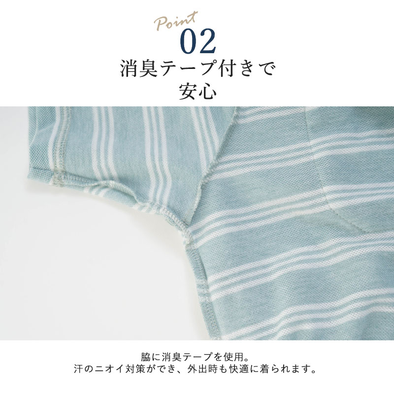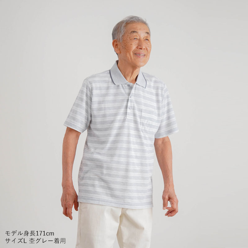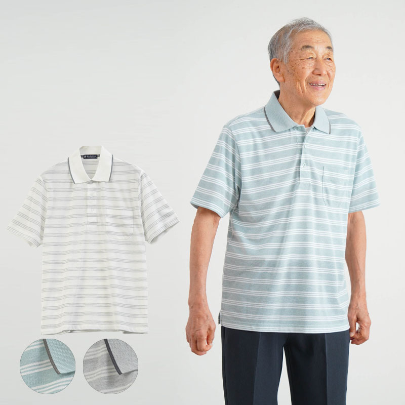 ● 上品なボーダー柄が魅力のポロシャツ。綿混素材でさらっとした肌ざわりが心地よく、見た目も涼しげです。