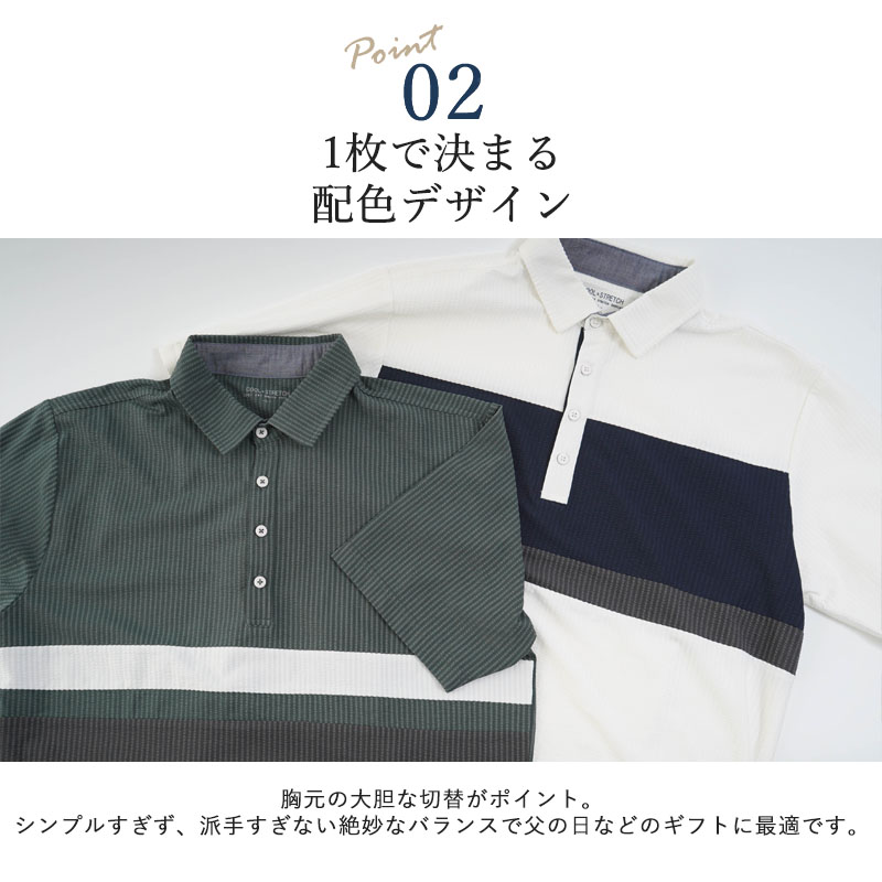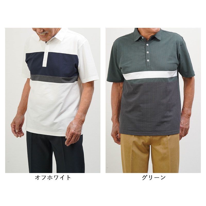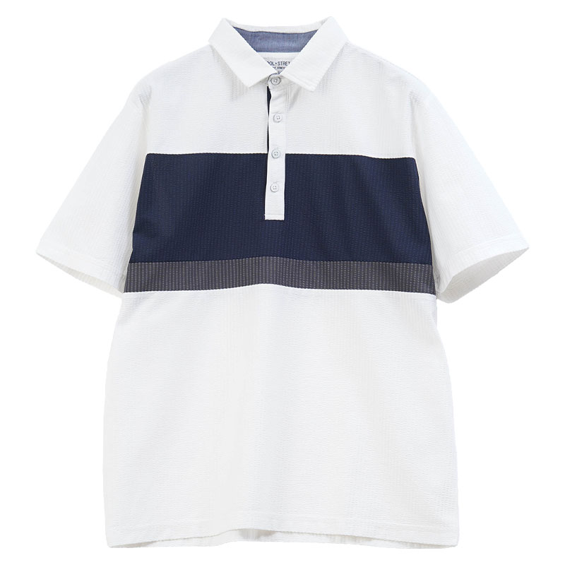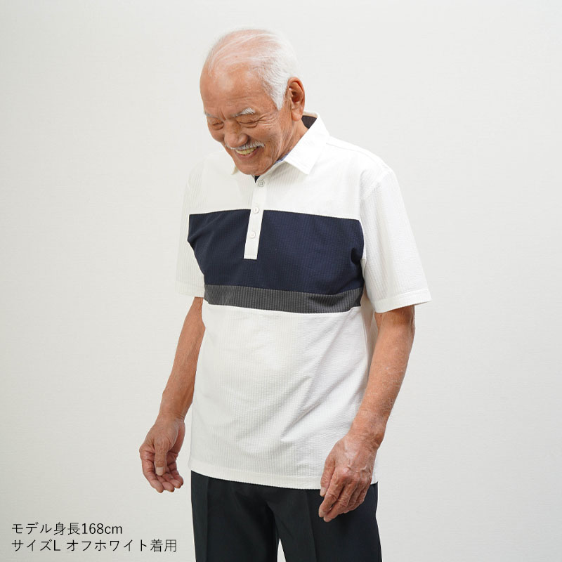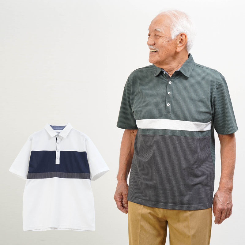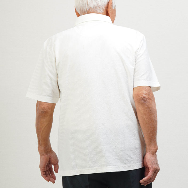 ●凹凸感のあるサッカー調素材で、汗ばむ季節もさらっと快適。暑がりなお父さんに嬉しい涼感ポロです。