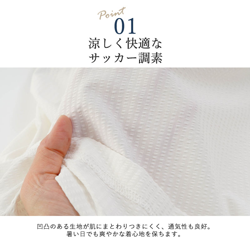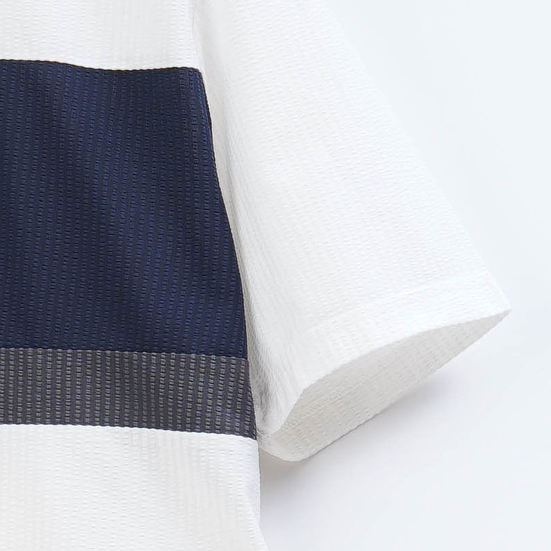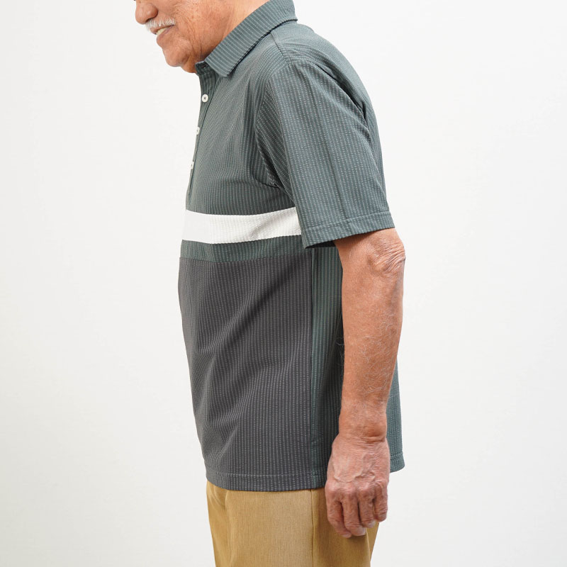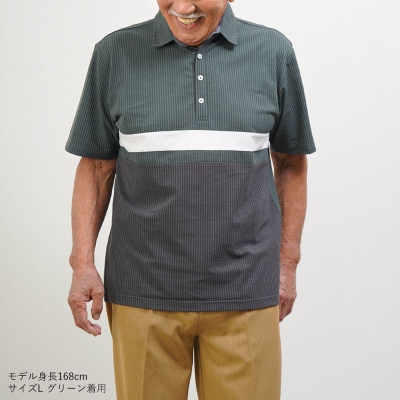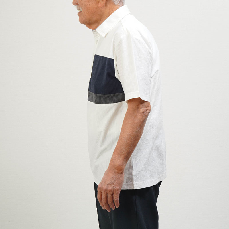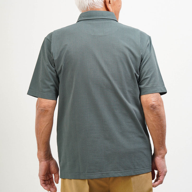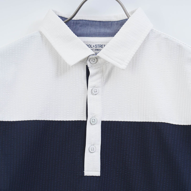 ●凹凸感のあるサッカー調素材で、汗ばむ季節もさらっと快適。暑がりなお父さんに嬉しい涼感ポロです。