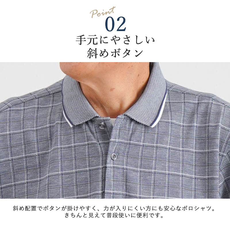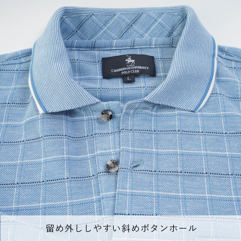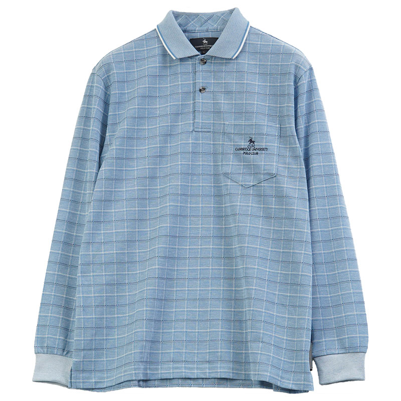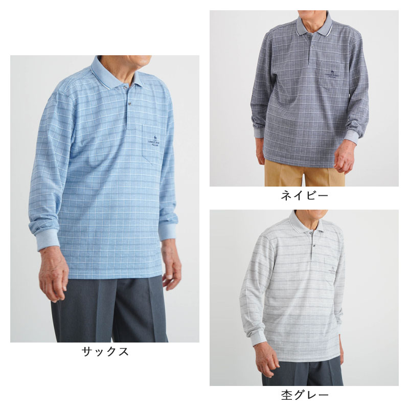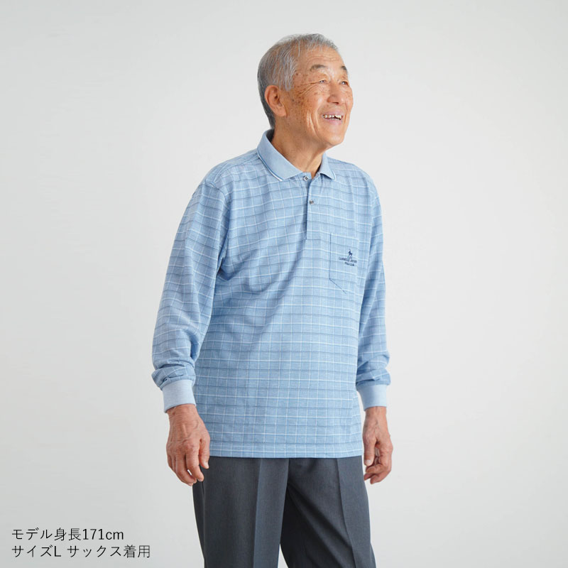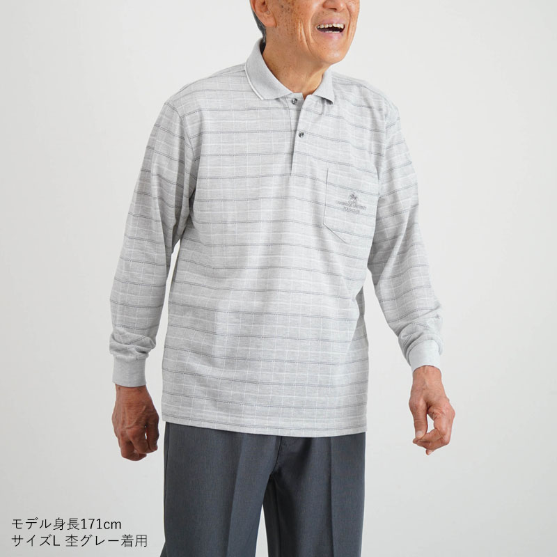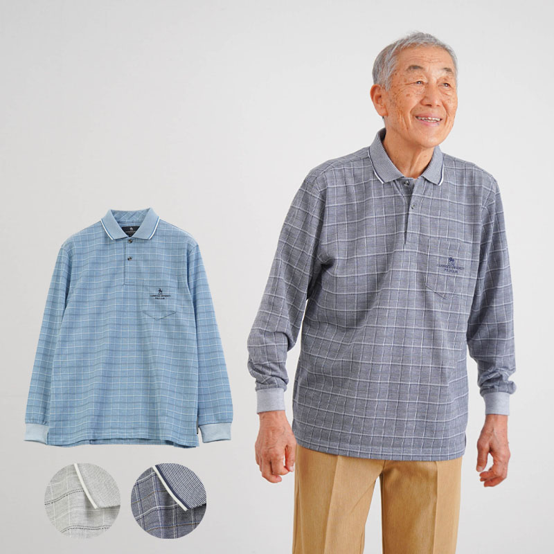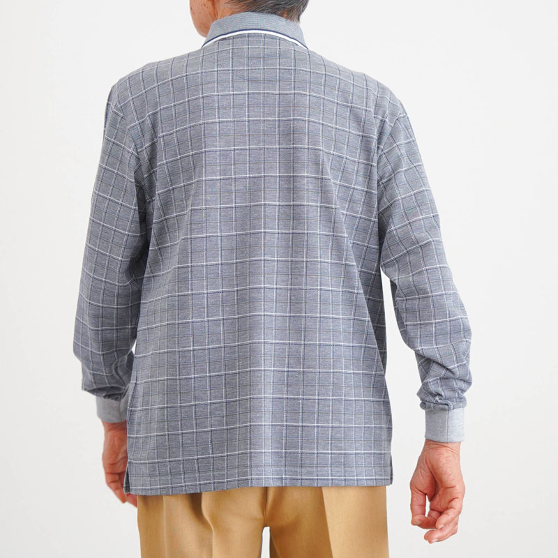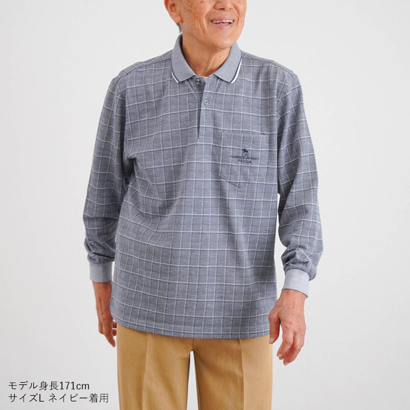 チェック柄 斜めボタンホール 長袖ポロシャツ