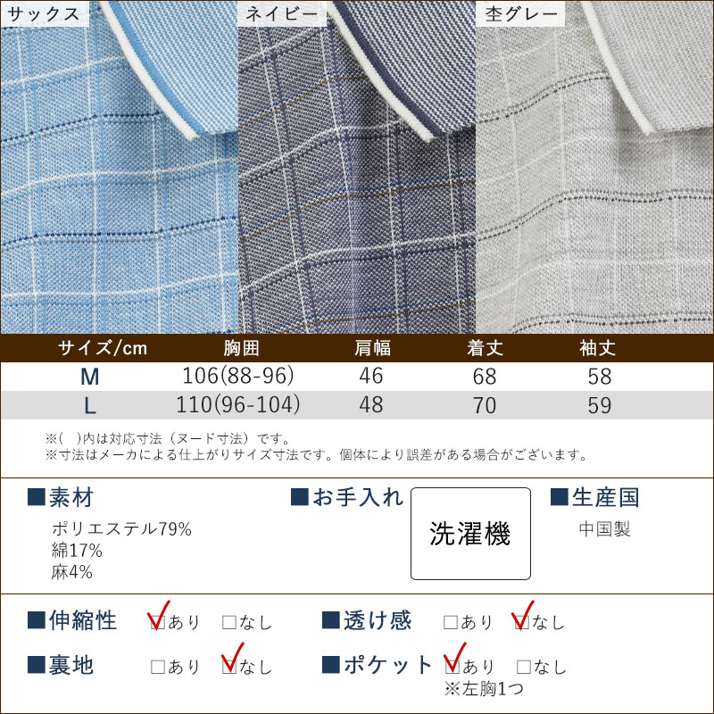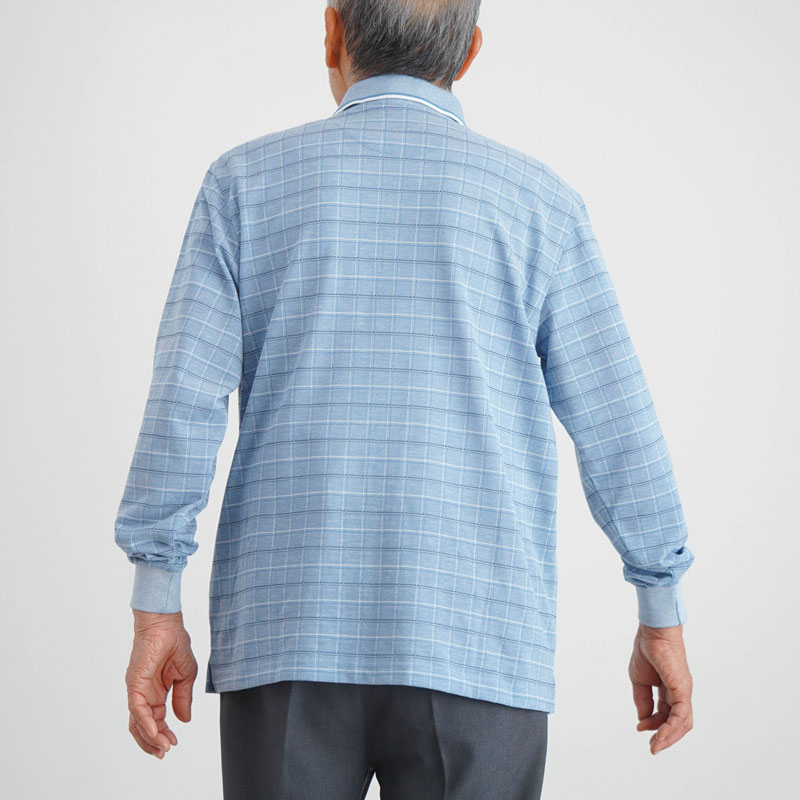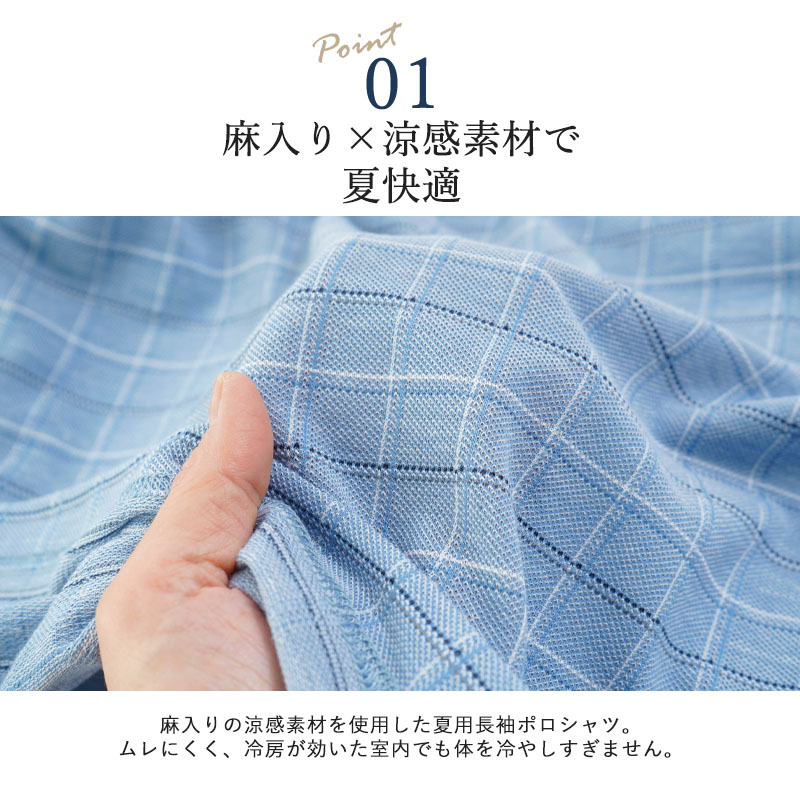 麻を混紡した夏用長袖ポロシャツ。通気性が良く、冷房対策や日よけにも活躍し、高齢者でも快適に着られます。