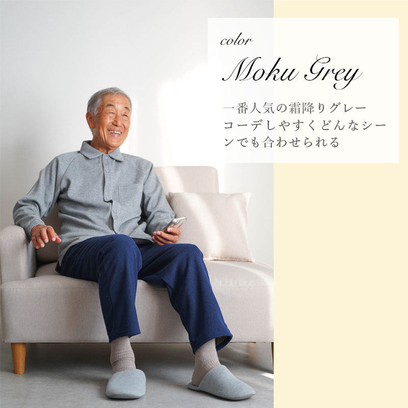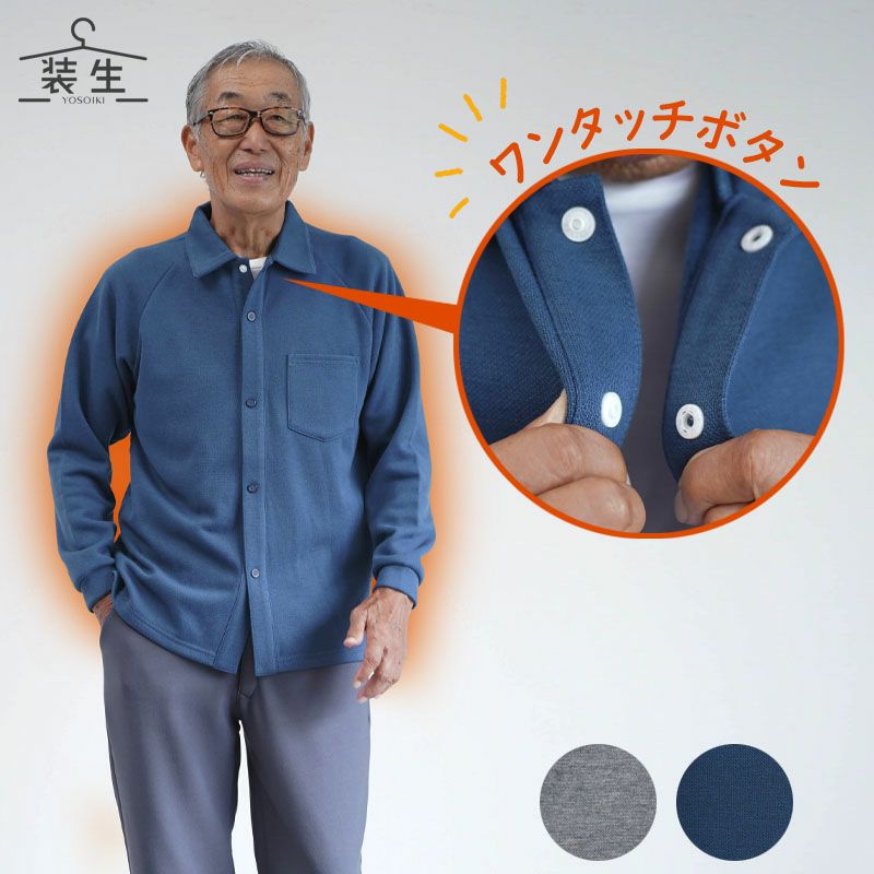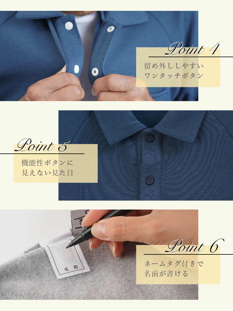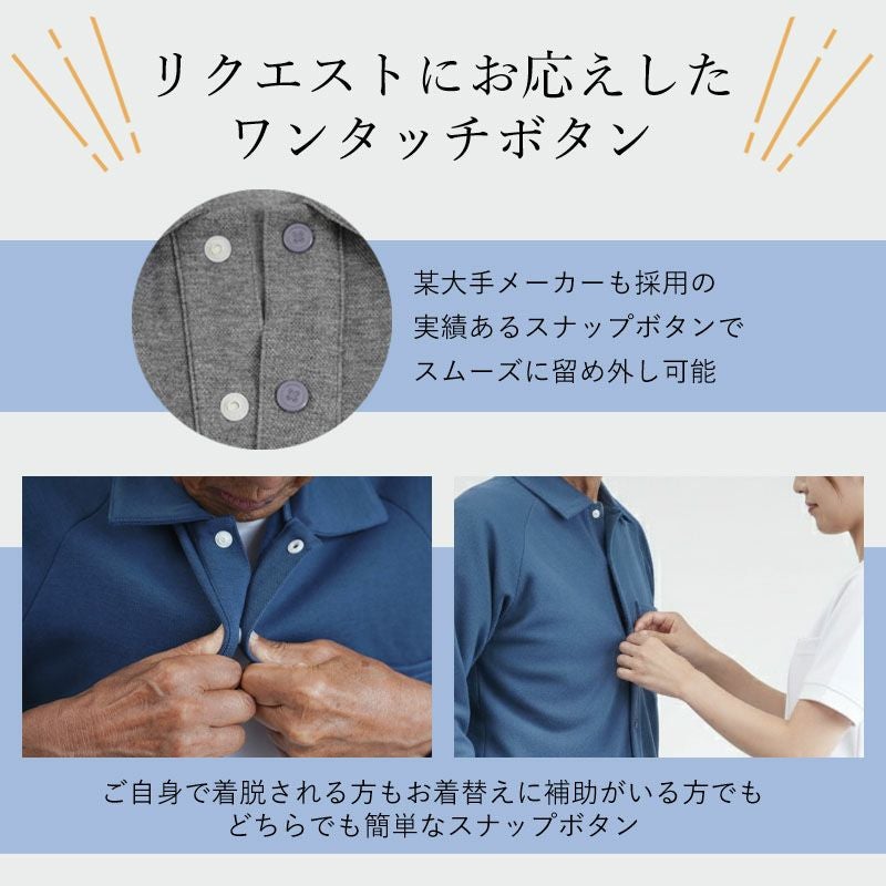 ●ワンタッチで留め外し可能なスナップボタン採用。名前が書けるタグ付きで、介護施設でも大変好評です。