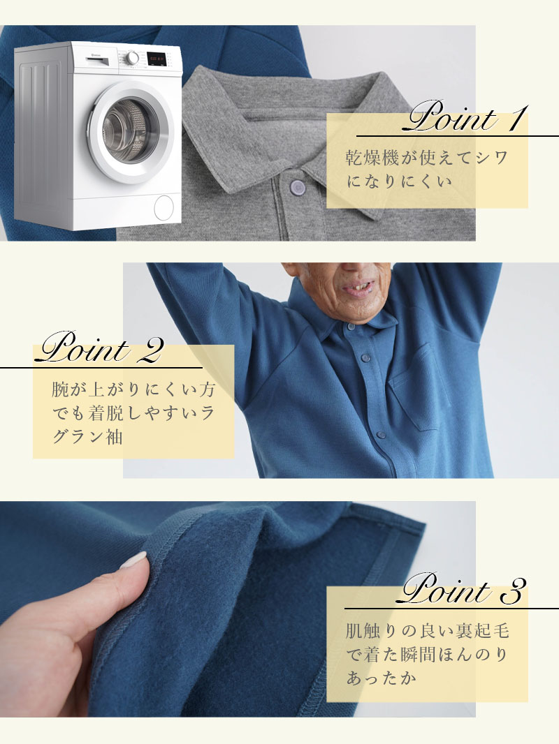 ●程よい厚みの裏起毛生地なので1枚で着用してもあたたかさを実感頂けます。洗濯機と乾燥機に対応し、日々のお手入れが簡単。