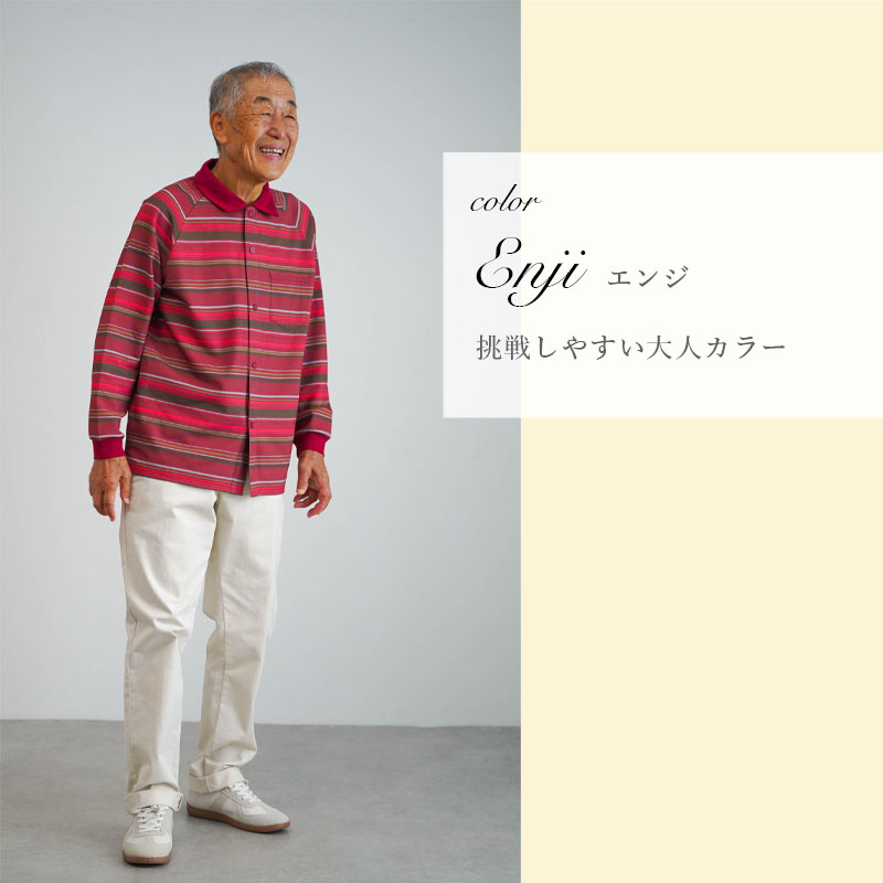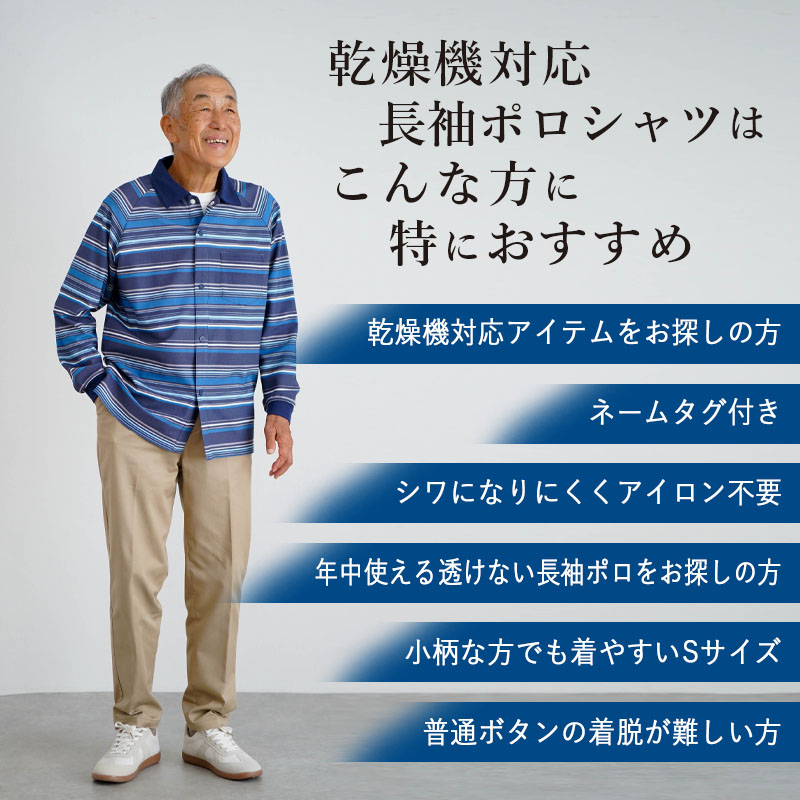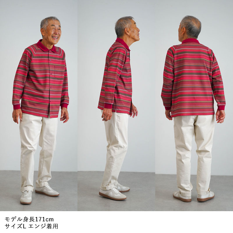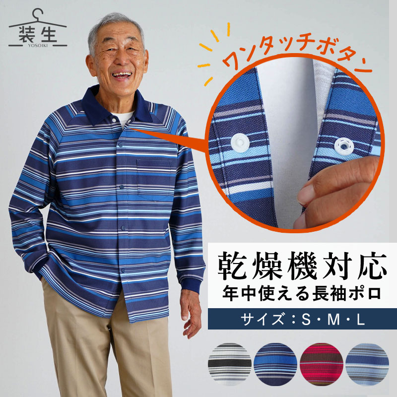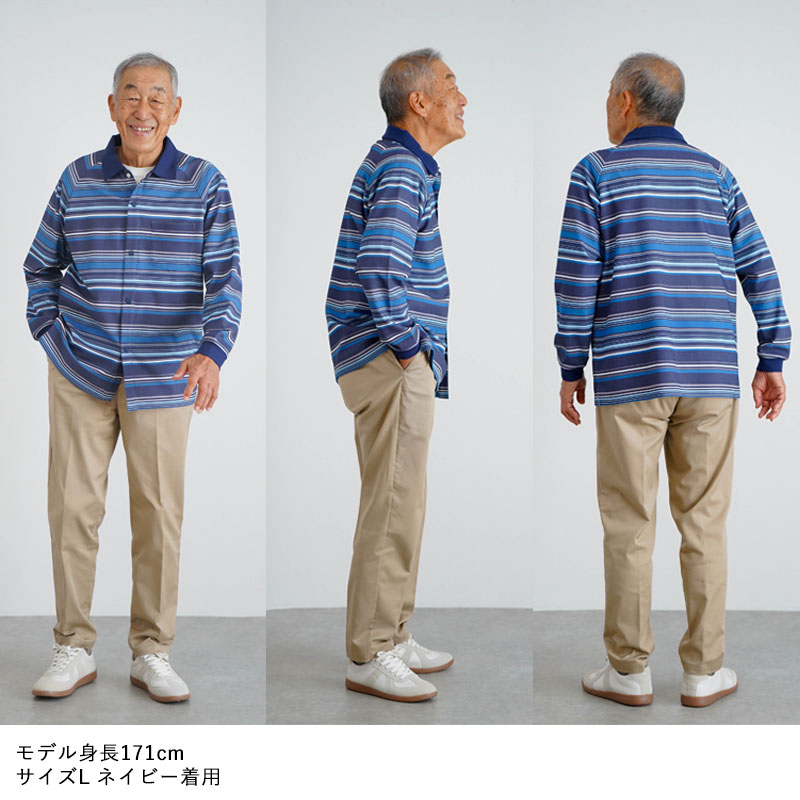 [装生] 乾燥機対応 紳士 鹿の子 長袖 前開き スナップボタン ボーダー ポロシャツ