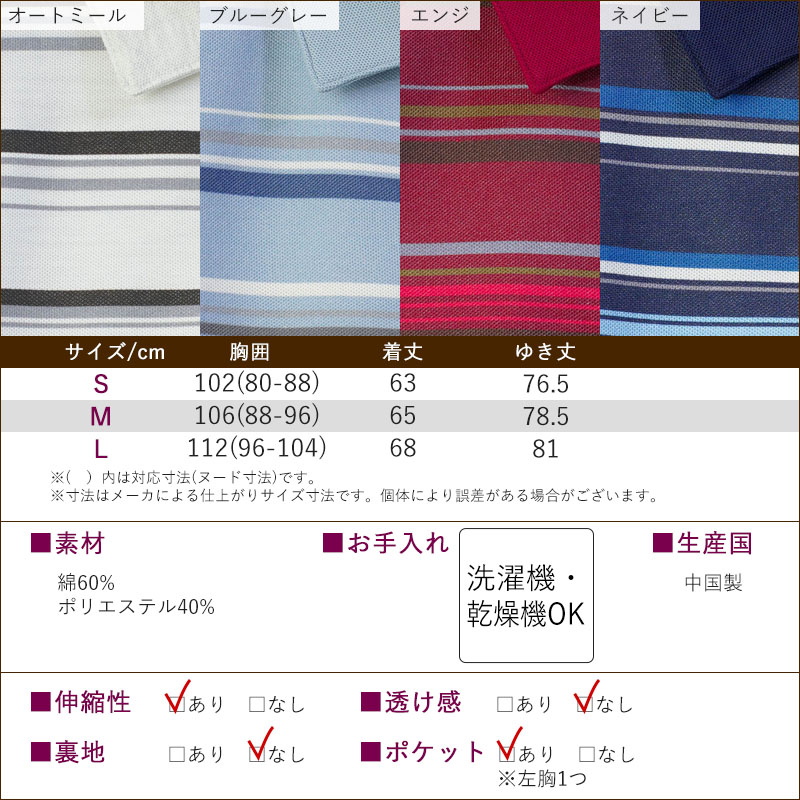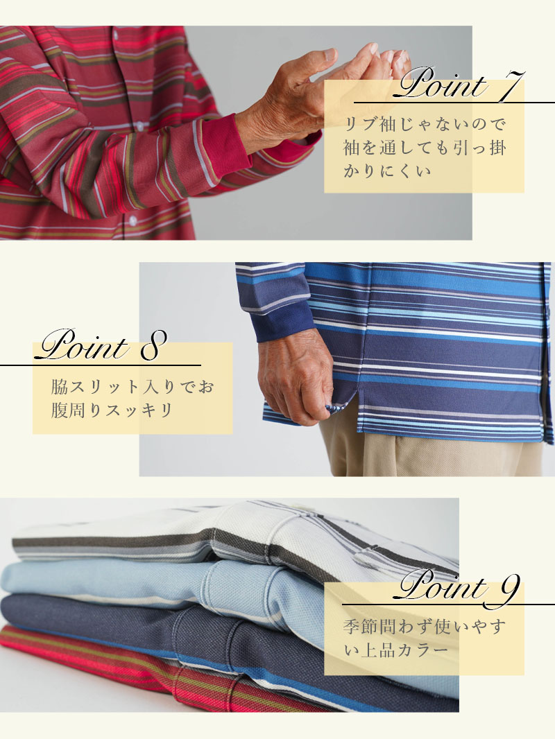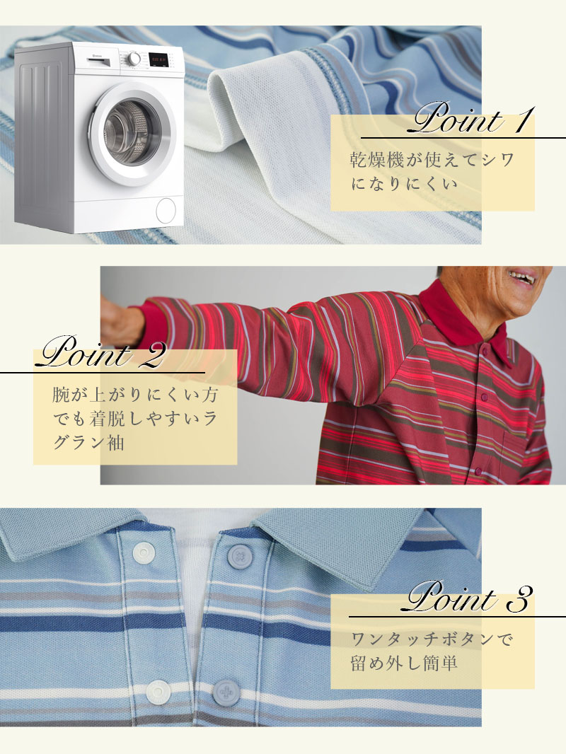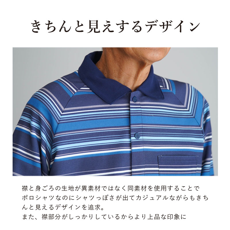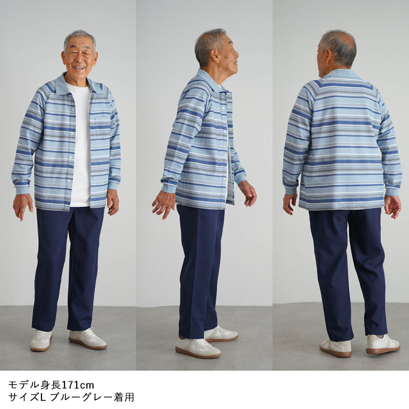 [装生] 乾燥機対応 紳士 鹿の子 長袖 前開き スナップボタン ボーダー ポロシャツ