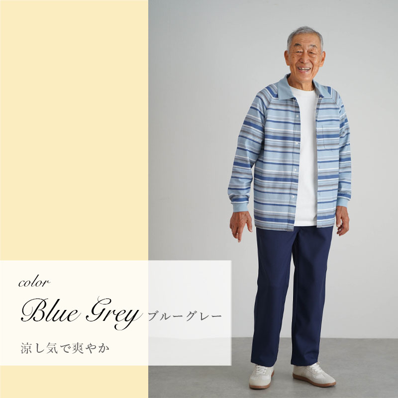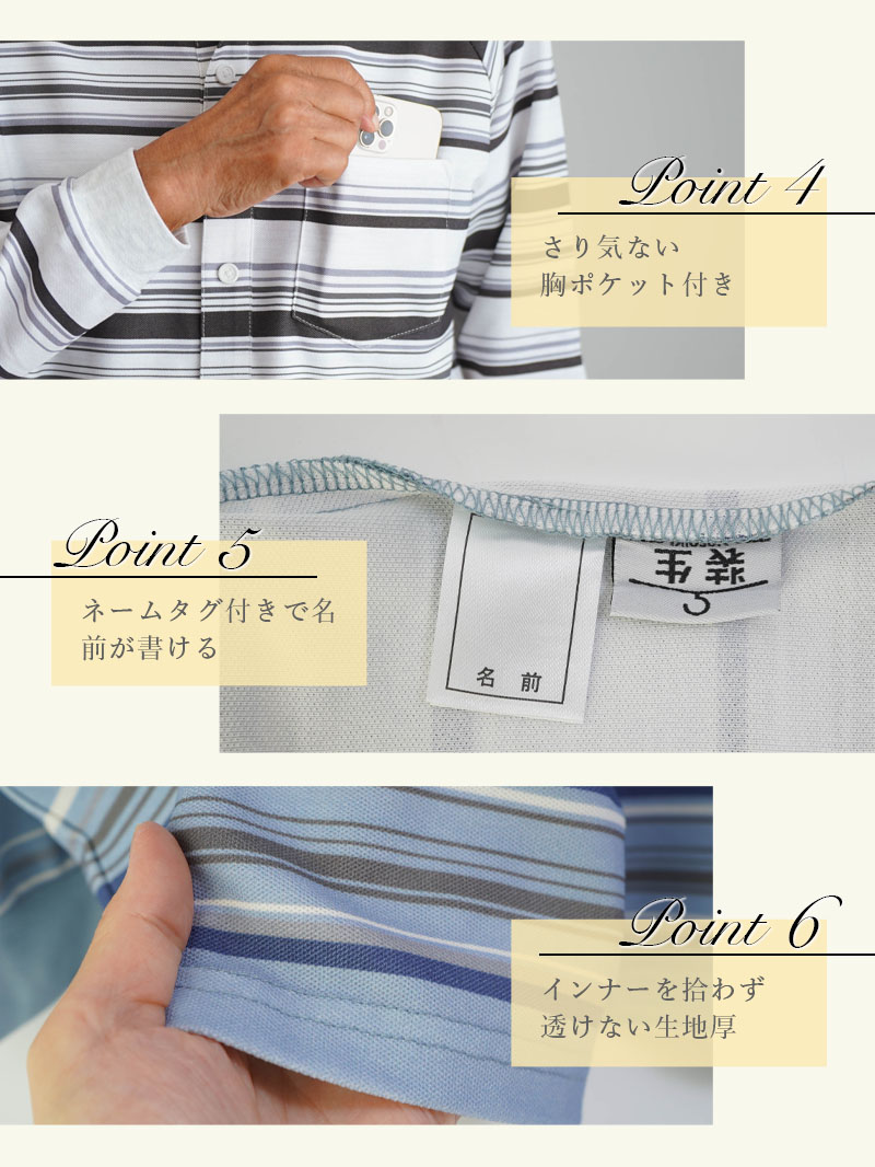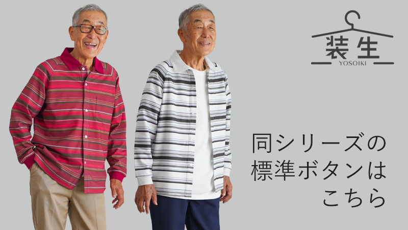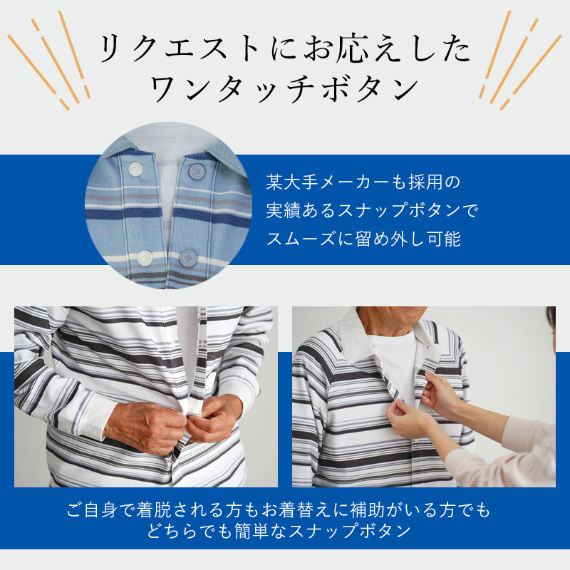 ●ワンタッチで留め外し可能なスナップボタン採用で着脱簡単。名前が書けるタグ付きで、介護施設でも大変好評です。