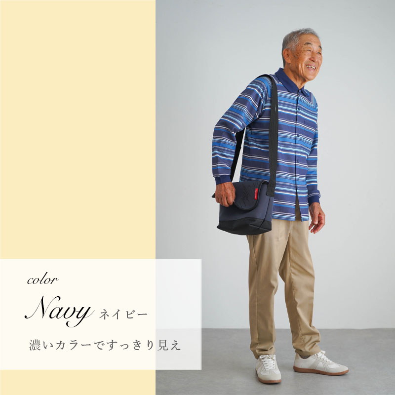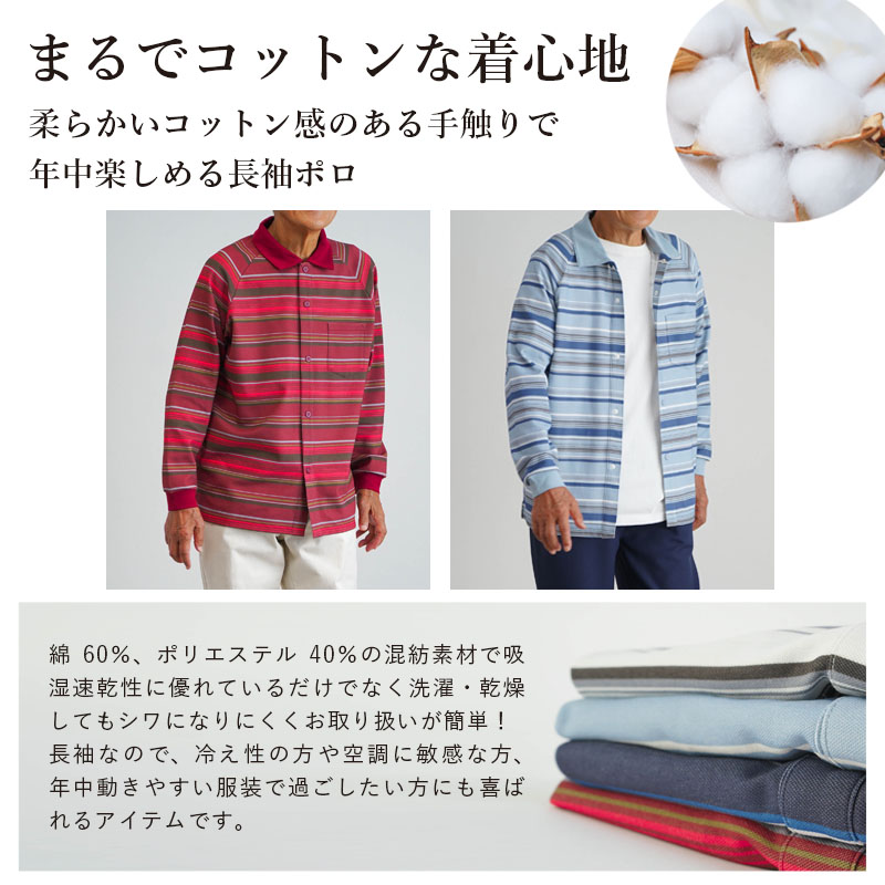 快適性と上品さを兼ね備えた、綿60%・ポリエステル40%混合の鹿の子生地長袖ボーダースナップボタンポロ。