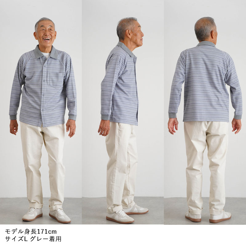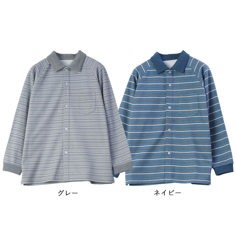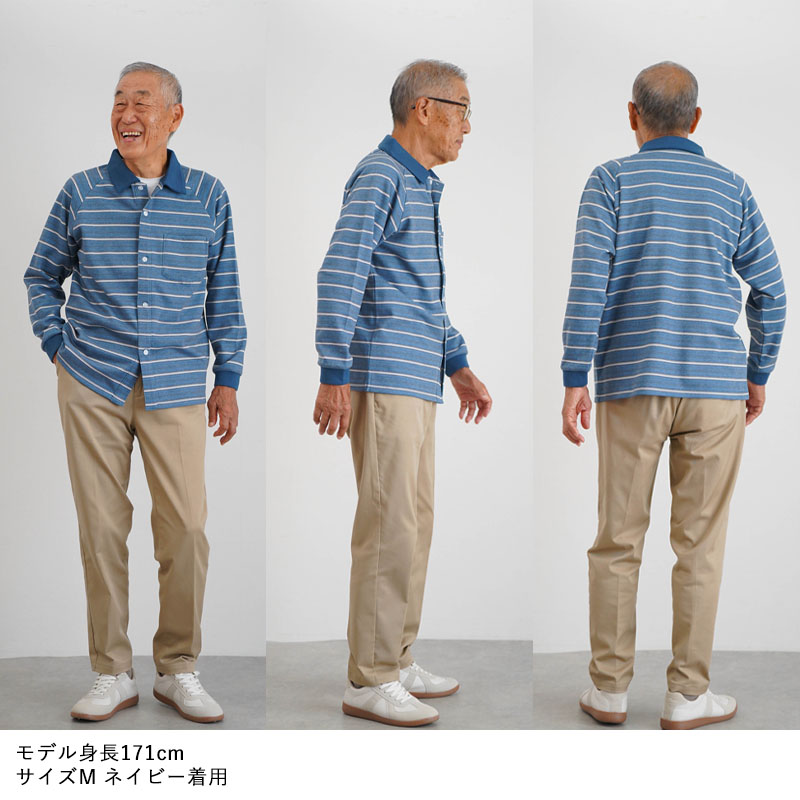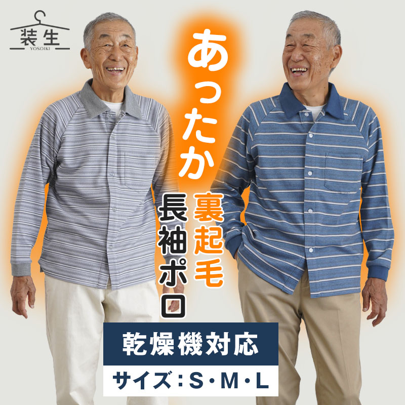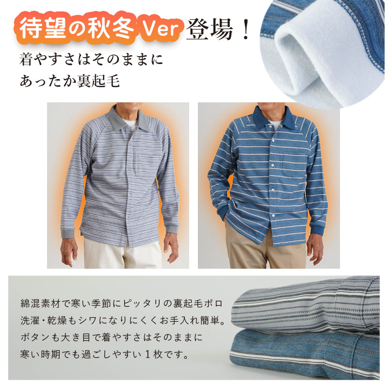 [装生] 乾燥機対応 紳士 裏起毛 ボーダープリント 前開き ポロシャツ