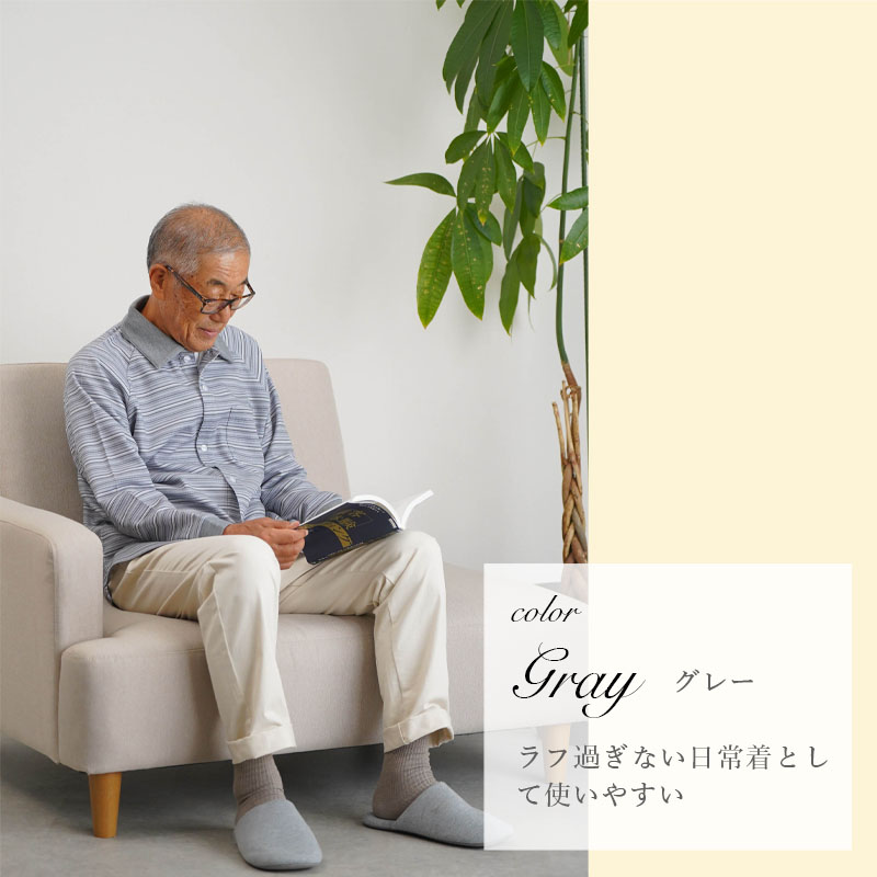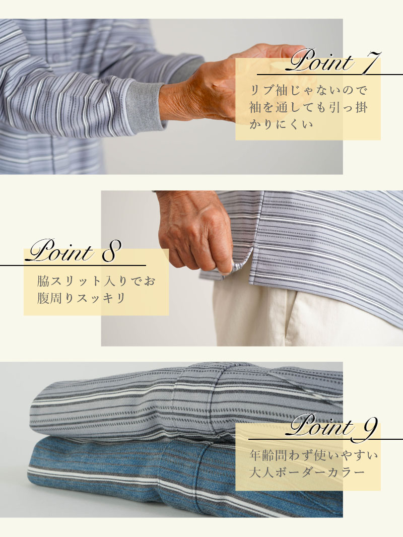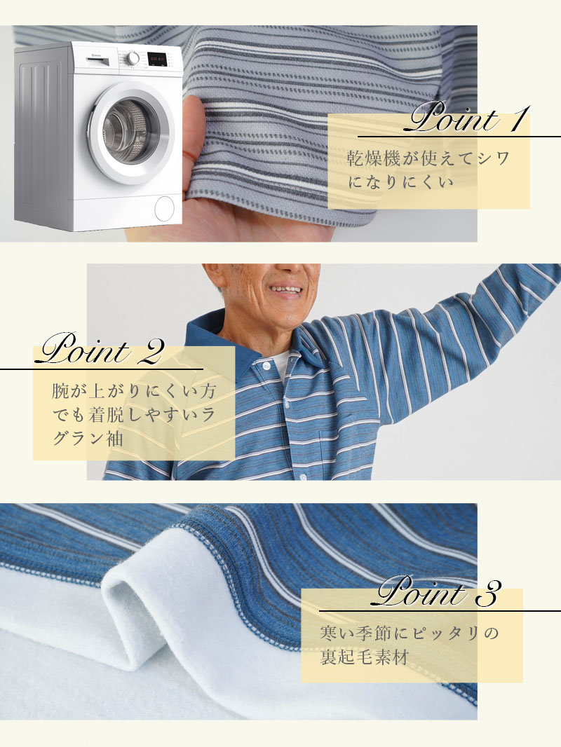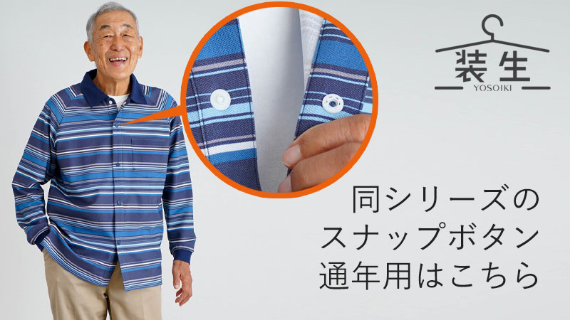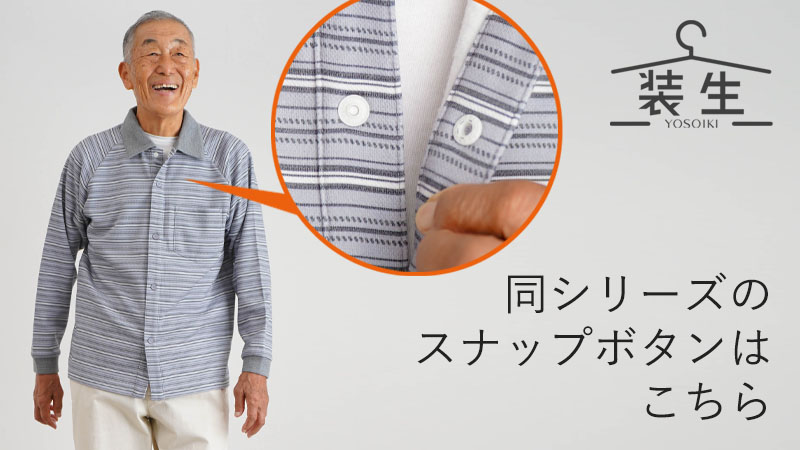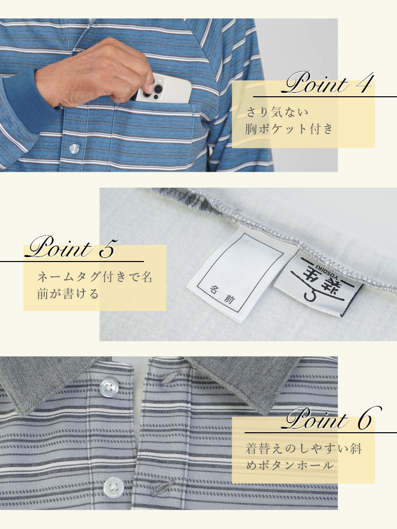 ●斜めボタンホールなのでボタンの留め外しが苦手な方でもお着替えしやすい仕様。名前が書けるタグ付いており、介護施設でも好評頂いている設計です。