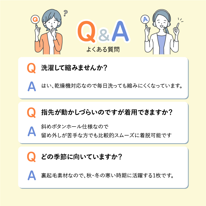 ●程よい厚みの裏起毛生地なので1枚で着用してもあたたかさを実感頂けます。洗濯機と乾燥機に対応し、日々のお手入れが簡単。
