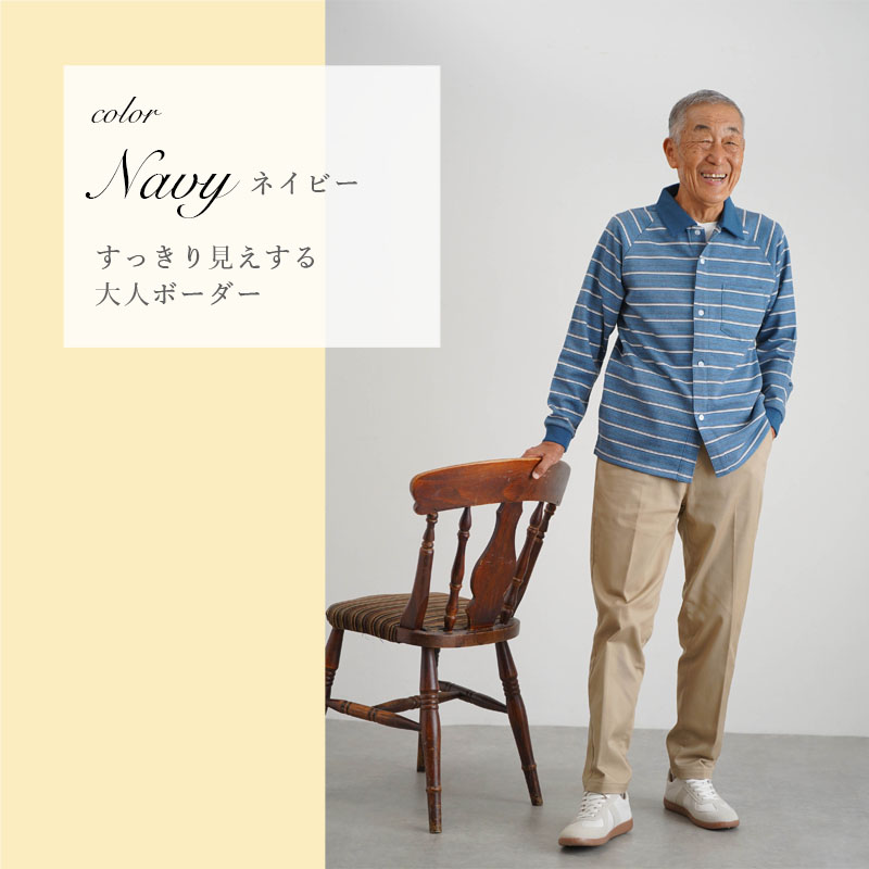秋冬仕様の前開き裏起毛長袖ボーダー柄ポロ。