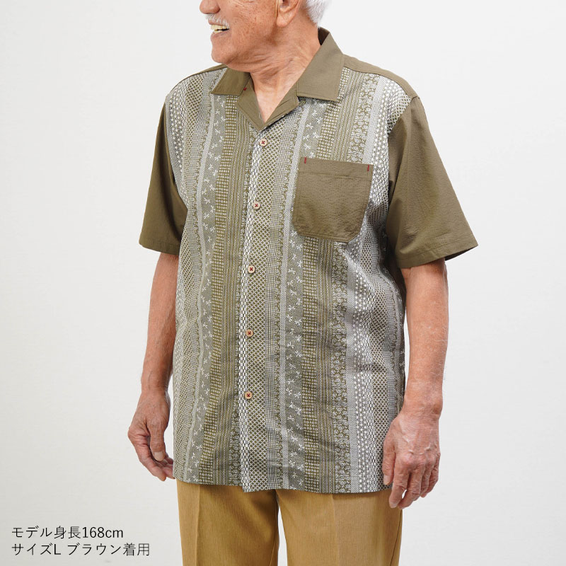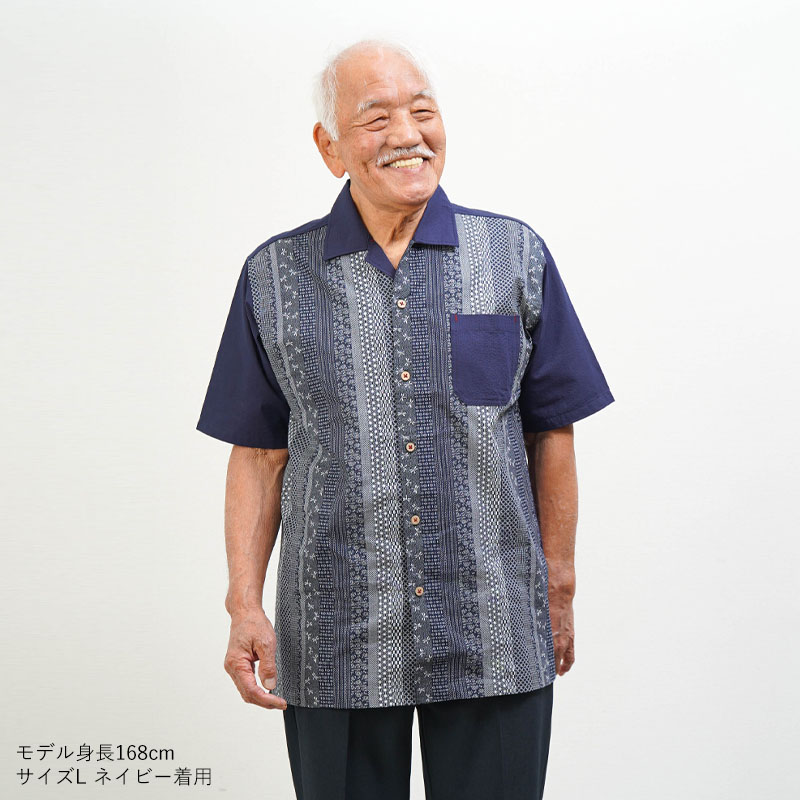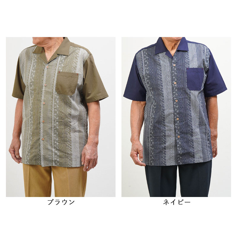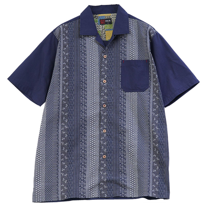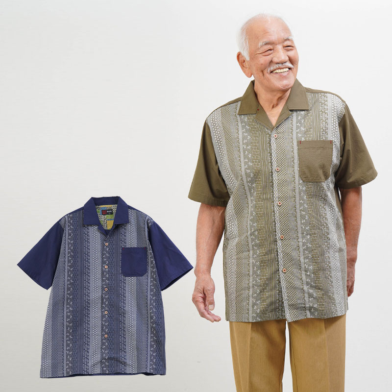 綿100% 和柄ストライプ 開襟 半袖シャツ