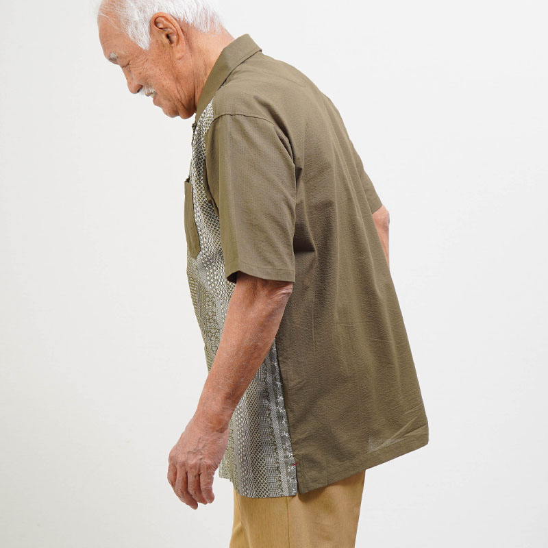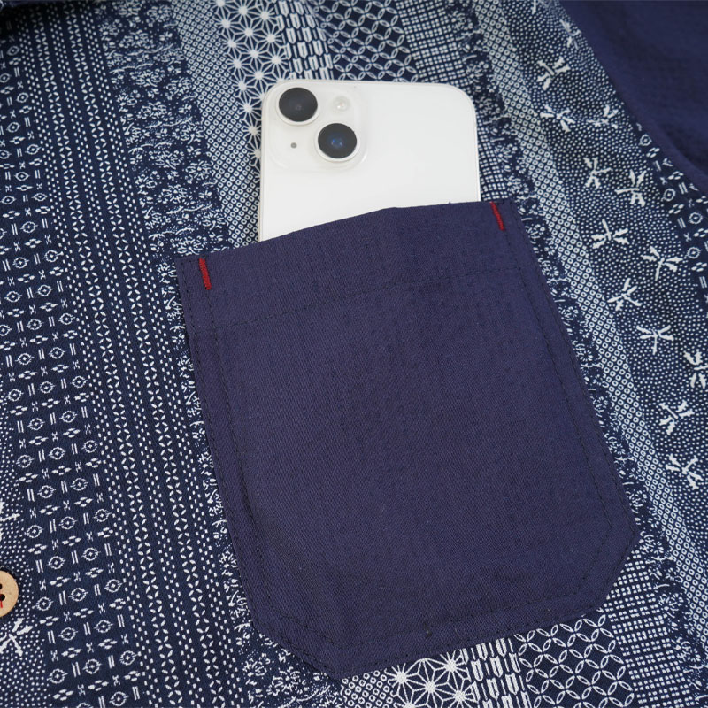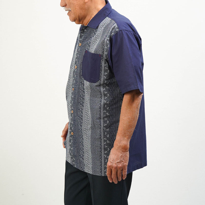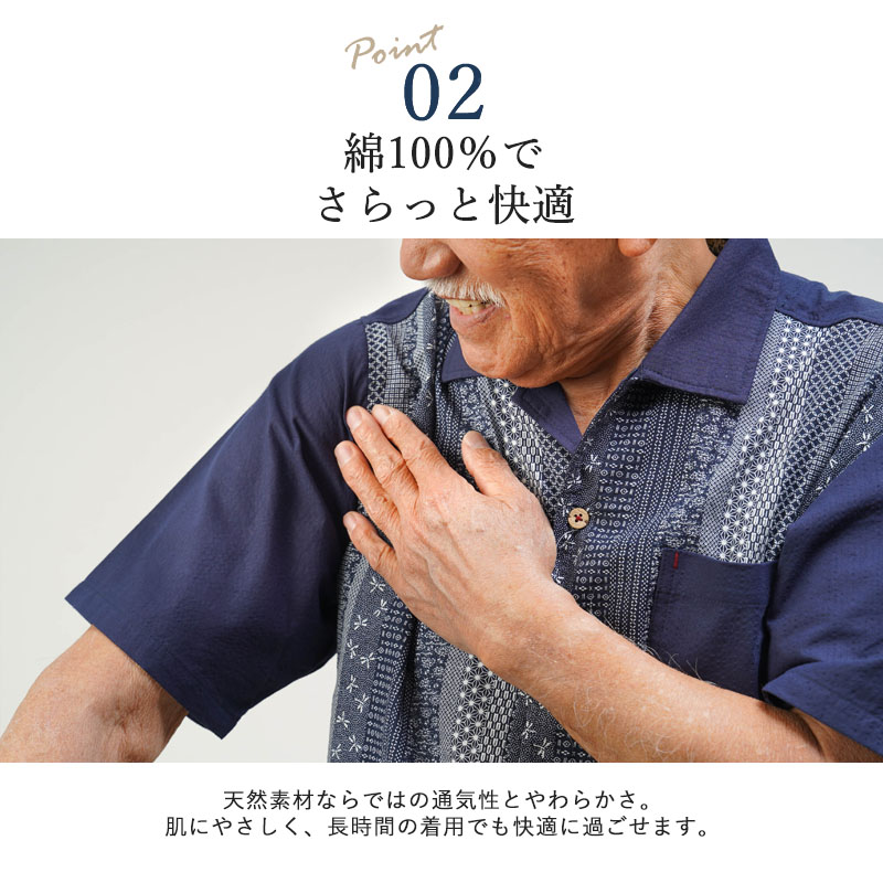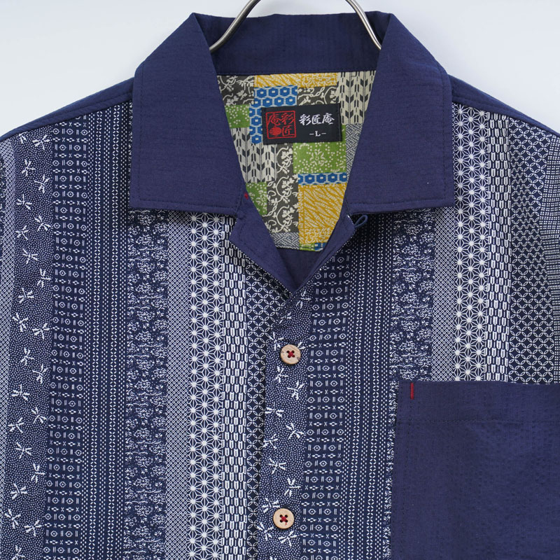 綿100% 和柄ストライプ 開襟 半袖シャツ