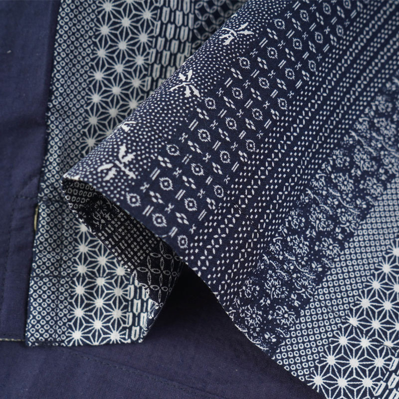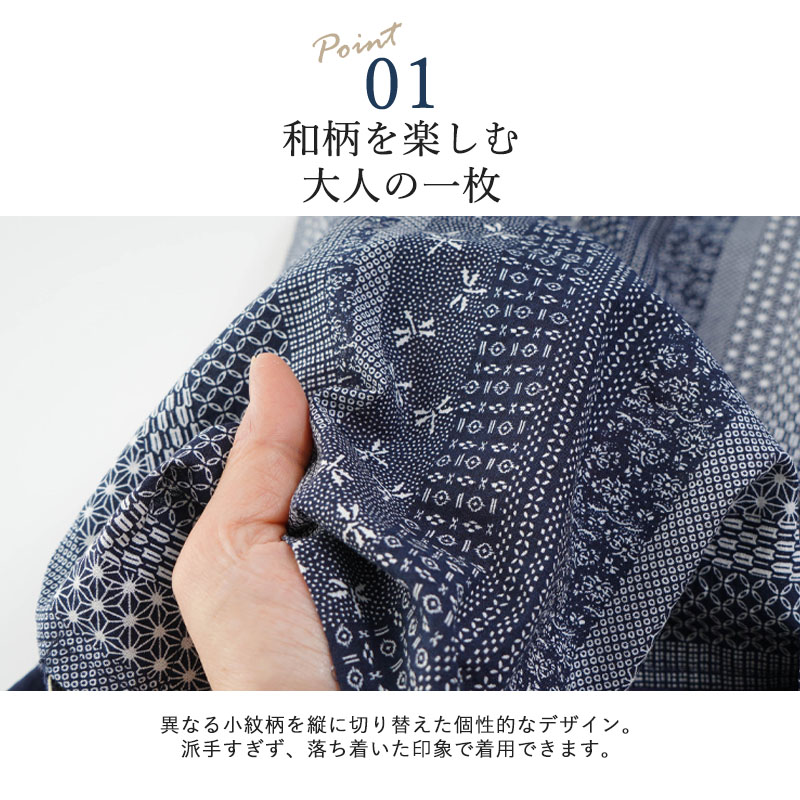 ●異なる小紋柄を縦に切り替えた和テイストのパッチワーク風デザイン。落ち着いた配色で上品に着こなせます。