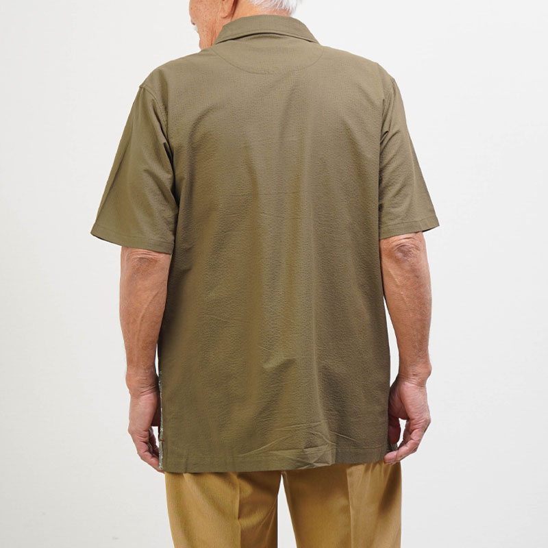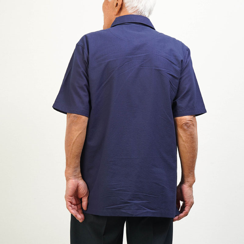 ●オープンカラー仕様で首元すっきり。前開きボタンで着脱も簡単、ゆったりとしたリラックスシルエットです。