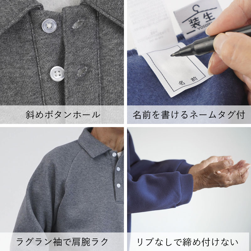 ●襟付きデザインでトレーナーながらきちんとした印象を与え、外出にも安心して着ていただけます。