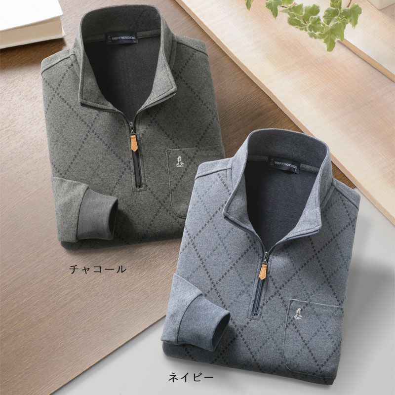 ダイヤ柄 ハーフジップ 両面起毛 薄手トレーナー