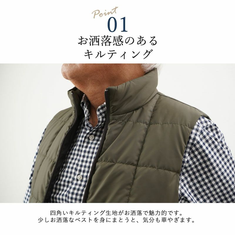 四角いキルティング生地がおしゃれな襟付き中綿ベスト。両脇と内側にポケットが1つついているので、必要なものだけポケットに入れて手ぶらでお出かけできますね。お散歩などちょっとした外出や、お家の中での防寒にもおすすめの1枚あると便利なベストです。ご自宅の洗濯機でお手入れ可能です。
