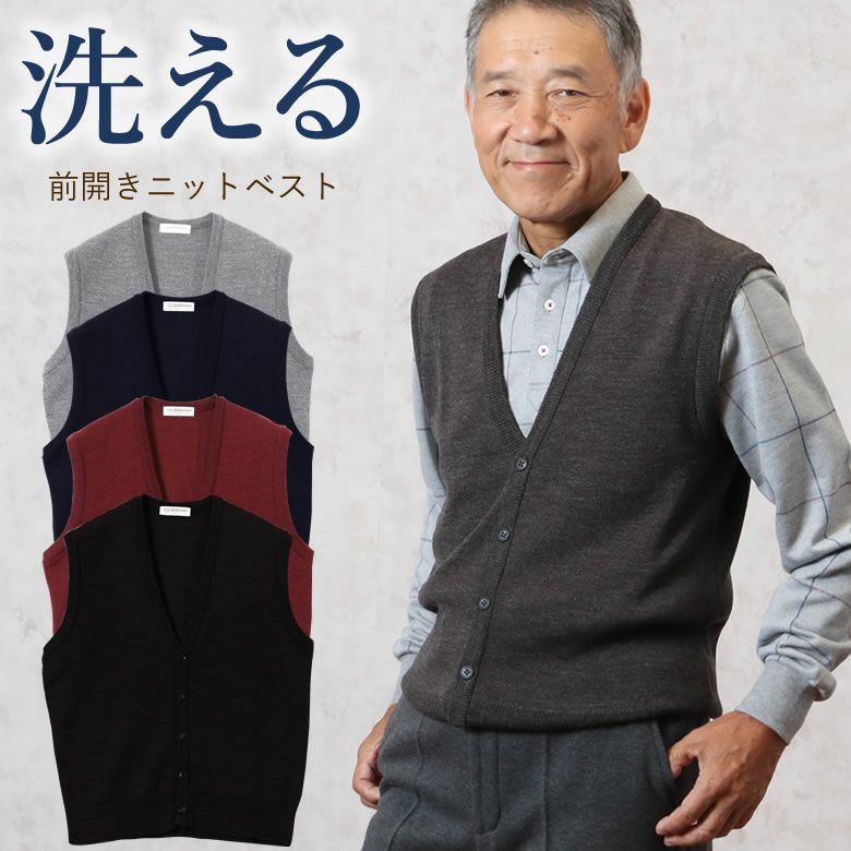 自宅の洗濯機で洗える、普段着に使いやすいベーシックな前開きベスト。