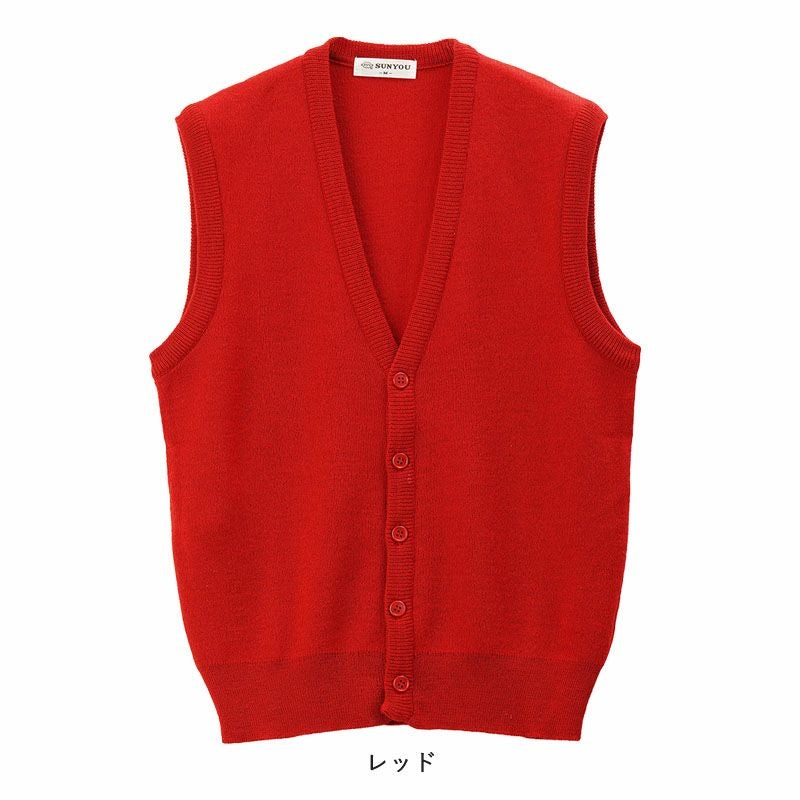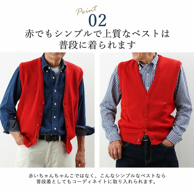 赤いベストというと派手に思えますが、シンプルなデザインのVネックベストなので、シャツやジャケット、スラックスなどいつものアイテムにもよく合います。