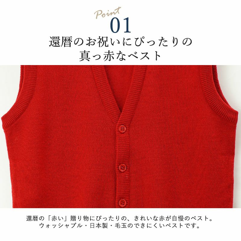 還暦祝いにおすすめの、赤い前開きニットベスト。 赤いちゃんちゃんこもいいですが、プレゼントするなら、これからも着られるアイテムならもっと嬉しいですよね。