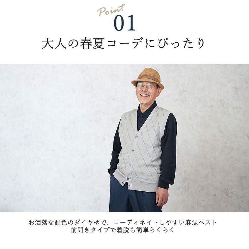 日本製 麻混 前開き ダイヤ柄 ニット ベスト