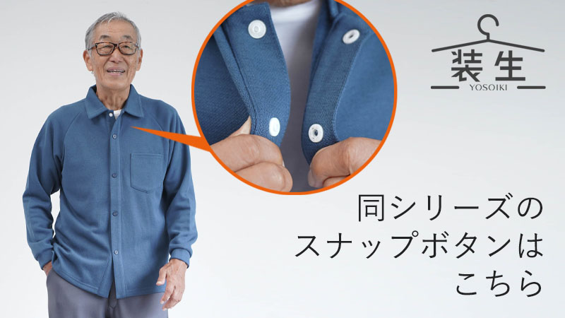 ●斜めのボタンホールと大きめのボタンで着脱が容易。名前が書けるタグ付きで、介護施設でも大変好評です。