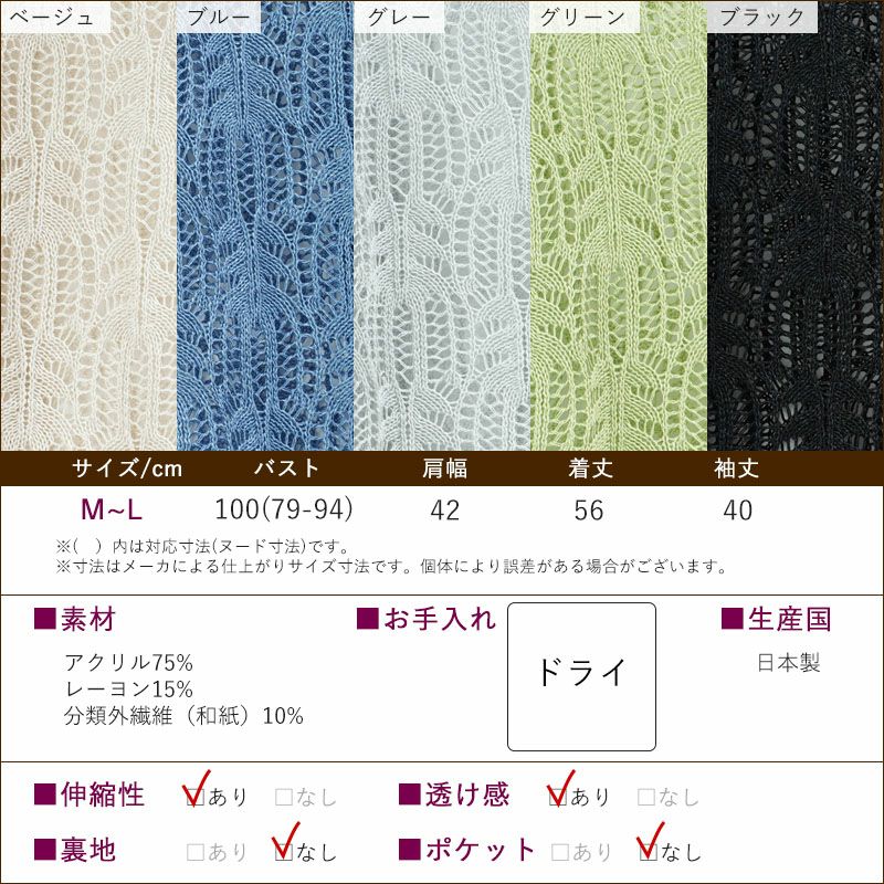 ●大き目ボタンで前開きの留め外しがしやすく、透かし編みで風通しが良く夏の羽織物に最適