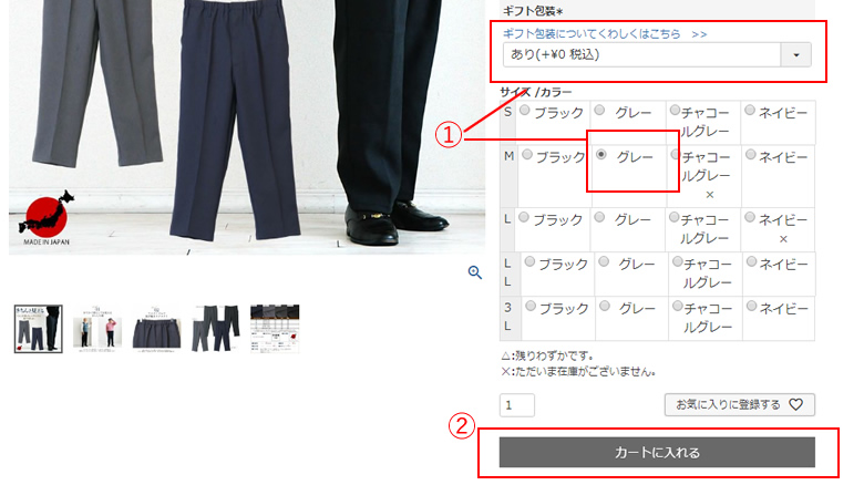購入される商品の商品ページより①(色、サイズ、オプション項目)をご選択いただき②(カートに入れる)ボタンを押してショッピングカートに商品を追加してください。