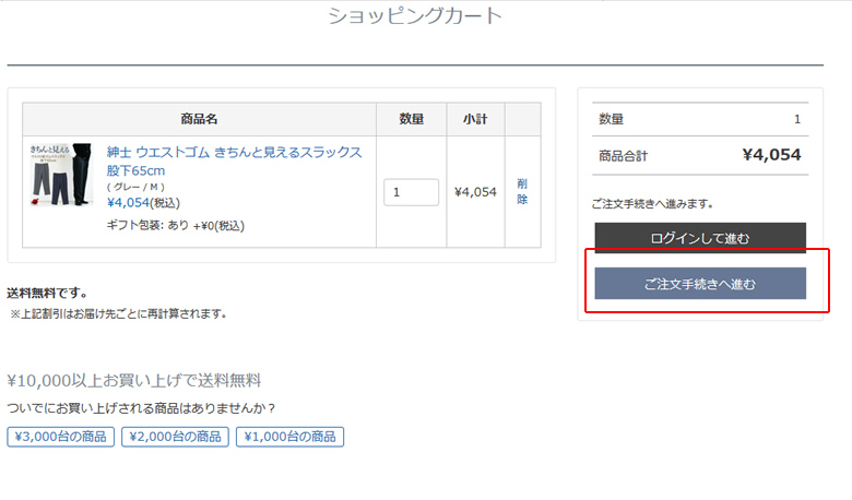 ショッピングカート内に商品が入りました。内容にお間違いが無ければ[ご注文手続きへ進む]をクリック