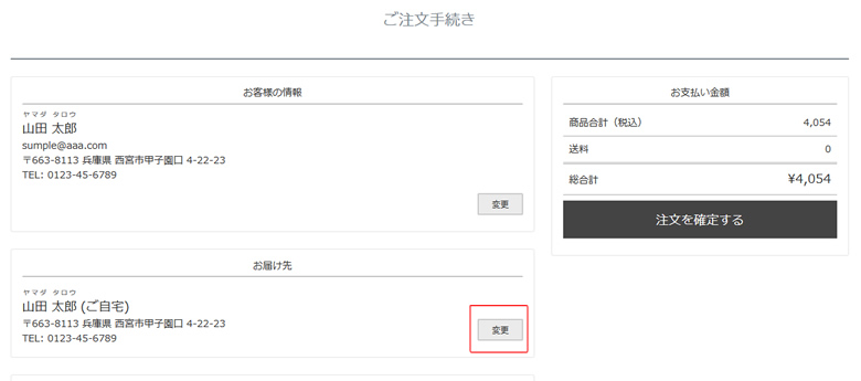 ご注文者様とお届け先が異なる場合は[お届け先]の[変更]ボタンを押してお届け先情報をご入力ください