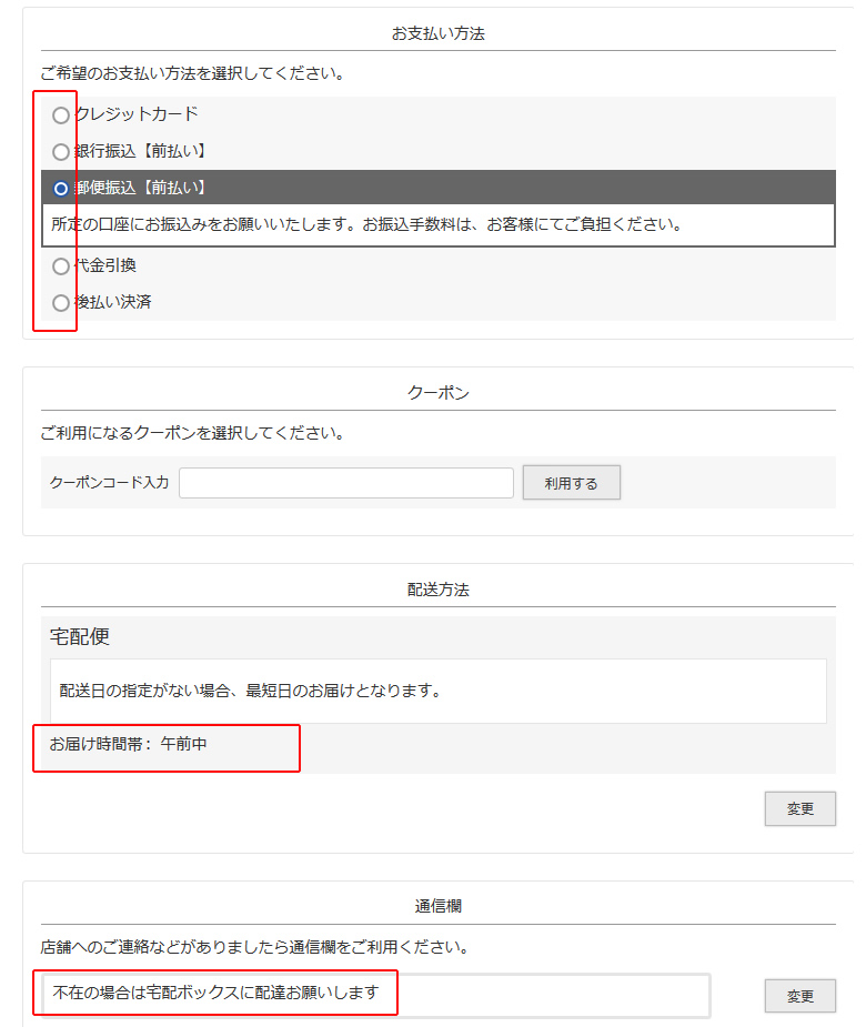 - クレジットカード、銀行振込(前払い)、後払い決済、郵便局前払い、代金引換が、ご利用いただけます。
